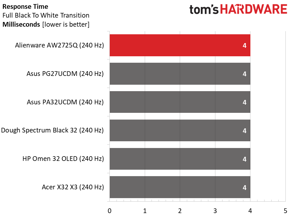 Независимо от того, рассматриваете ли вы тестовые шаблоны или реальный контент, разрешение не падает при движении объектов или фона. Показатель в 4 мс — это стандарт, который получает любой OLED-дисплей с частотой 240 Гц, независимо от разрешения панели. Также стоит отметить, что в AW2725Q отсутствует функция вставки чёрного кадра (BFI).