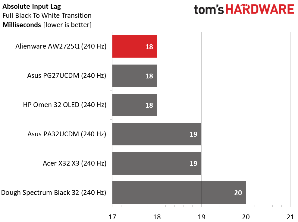 Итоги теста: AW2725Q наравне с HP Omen 32 OLED и Asus PG27UCDM стал самым быстрым 4K OLED-монитором с общей задержкой управления 18 мс. Это быстро по любым меркам, как для казуальных геймеров, так и для опытных киберспортсменов. Плавность картинки обеспечивает чёткость изображения независимо от скорости происходящего на экране. Если вам нужен ещё более быстрый монитор, придётся пожертвовать разрешением и выбрать QHD-модель, например, Philips 27M2N8500 с частотой обновления 360 Гц. Однако для игр в разрешении 4K лучшего варианта не найти.