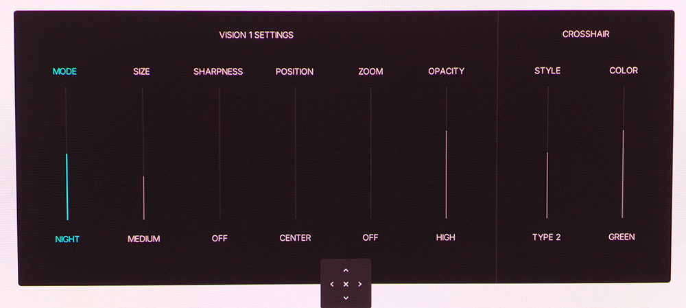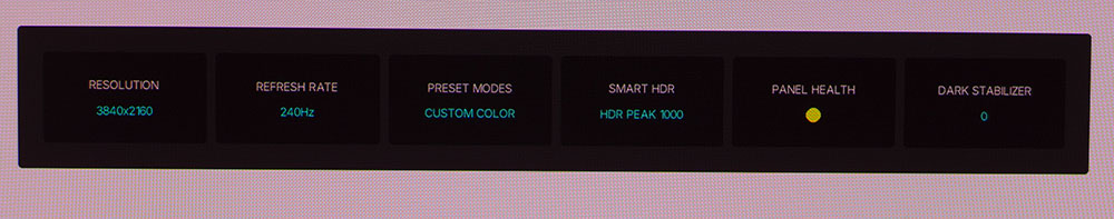 Нажатие на джойстик открывает небольшое меню значков со строкой состояния сигнала в верхней части экрана. Индикатор состояния панели (зелёный, жёлтый или красный) показывает, когда приближается цикл обновления пикселей. Доступны пять функций быстрого доступа, которые можно программировать вручную. Щелчок вверх открывает полное экранное меню.