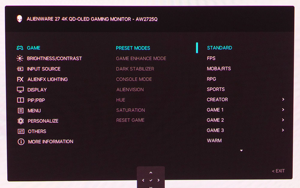 Проще всего наслаждаться AW2725Q в стандартном режиме, установленном по умолчанию. Он обеспечивает практически идеальную цветопередачу и оттенки серого, но имеет слабый трекинг гаммы. Для тех, кто ищет возможности для дополнительной настройки, предусмотрены режимы «Создатель» (Creator) и «Пользовательский цвет» (Custom Color), о которых я сейчас расскажу подробнее.