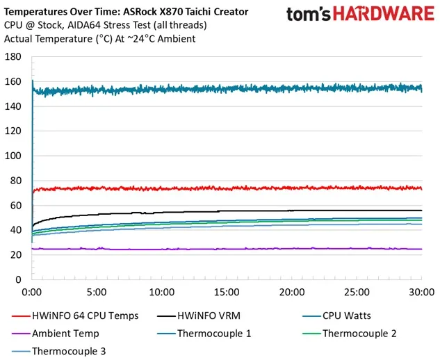 Для тестирования энергопотребления мы использовали тест стабильности системы AIDA64 с нагрузкой на CPU, FPU, кэш и память, фиксируя пиковое значение потребления процессора. Показания снимались с помощью ваттметра Kill-A-Watt, подключенного к розетке, для всего ПК (без учета монитора). Единственная переменная — материнская плата; все остальные компоненты оставались неизменными. Обратите внимание, что мы перешли на использование только графиков потребления/температуры в стоке, так как этот раздел призван подтвердить способность подсистемы питания справляться с флагманскими процессорами.