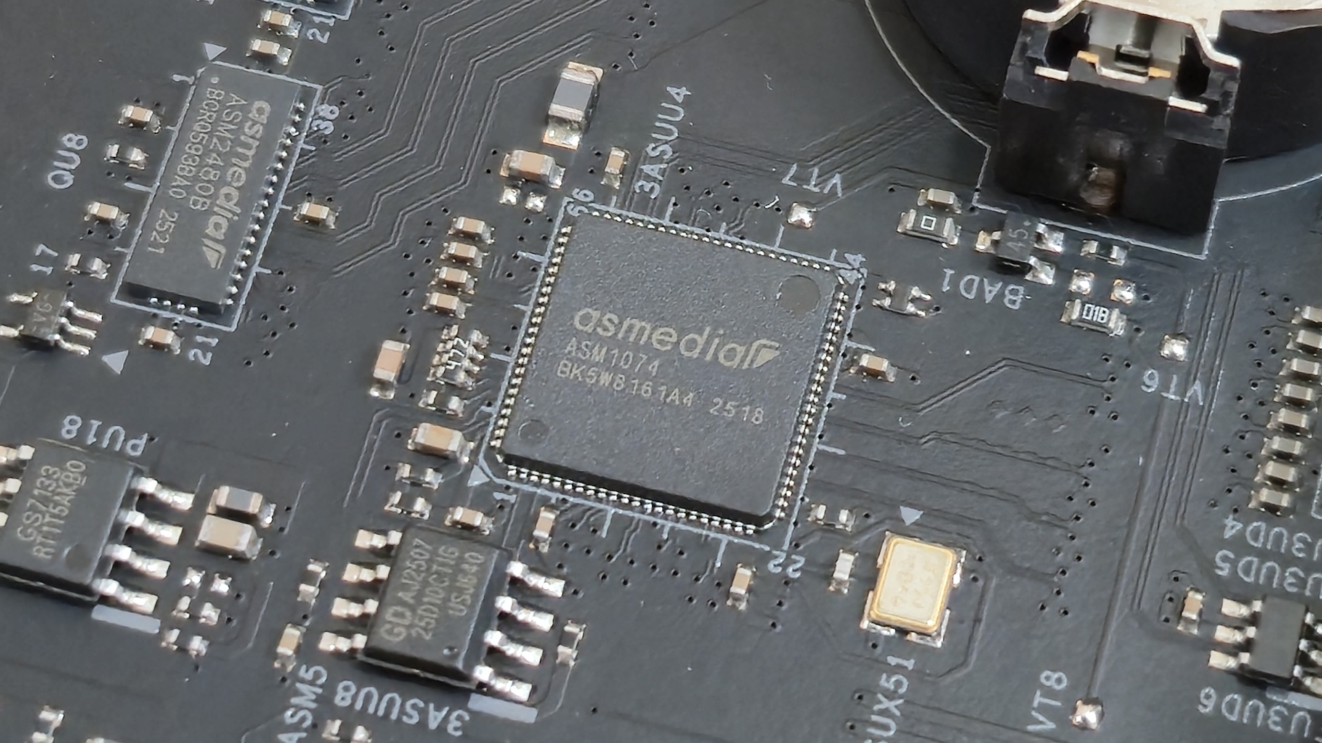 Прежде чем перейти к задней панели ввода-вывода, мы сделали несколько снимков встроенных микросхем, управляющих некоторыми функциями платы. Сюда входят ASMedia 1074 (две штуки, USB 3.0), ASM1164 (контроллер PCIe-SATA), модули VRM Monolithic Power Systems (MPS2425) и контроллер (MPS2512), а также несколько чипов Realtek для питания и звука через USB-C.