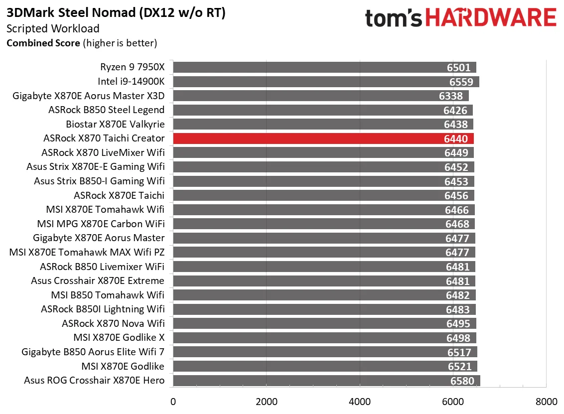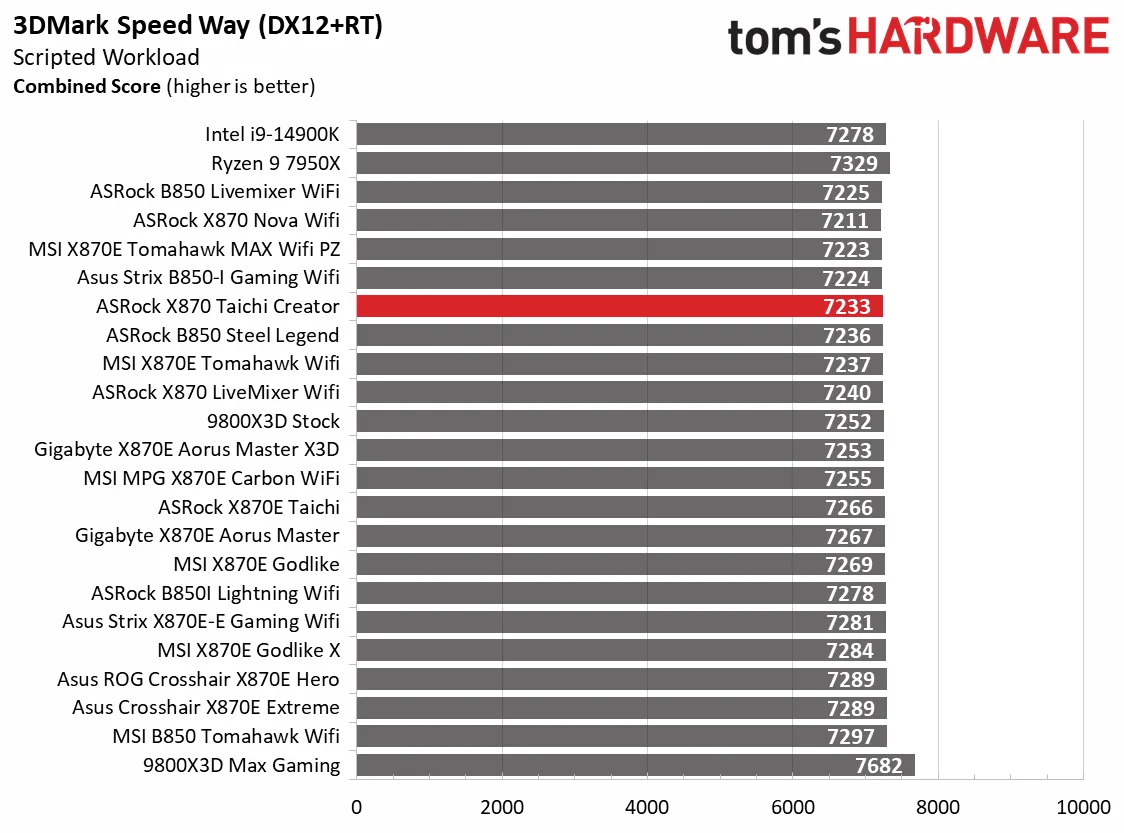 В этом ценовом диапазоне есть и другие платы, не позиционирующиеся как решения для авторов контента, но большинство из них либо не имеют трех слотов PCIe — например, Asus ROG Strix X870-A Gaming Wi-Fi (26 тыс. руб.) и Gigabyte X870 Aorus Stealth Ice (24 тыс. руб.), — либо имеют ограниченное пространство для размещения компонентов, как MSI X870 Tomahawk Wi-Fi (сейчас около 20 тыс. руб.). Хотя ASRock X870 Taichi Creator хороша и по текущей цене, и стоит своих денег для тех, кому нужны ее специфические функции, я бы хотел, чтобы ее стоимость снизилась примерно до 24 тыс. руб. — это сделало бы ее привлекательной для еще более широкой аудитории.