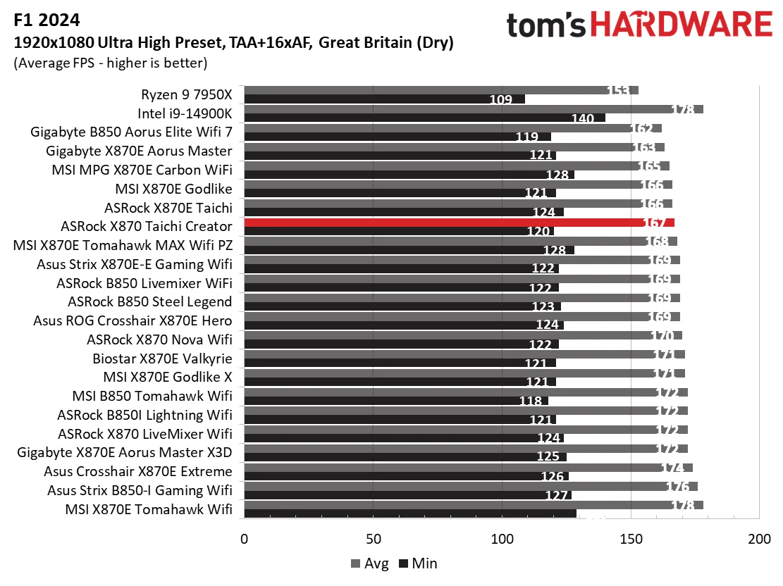 Цель этих настроек — выявить различия в производительности при наиболее популярном разрешении (которое сильнее зависит от процессора и системы в целом) с настройками графики, к которым стремится большинство пользователей (Ultra). Мы ожидаем, что разница между материнскими платами в этих тестах будет незначительной, в большинстве случаев оставаясь в пределах погрешности. Мы также добавили показатель минимального FPS, так как он может влиять на плавность геймплея и погружение в игру.