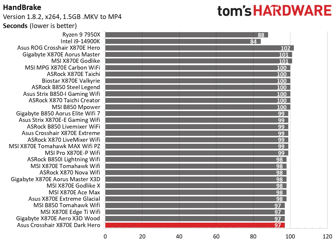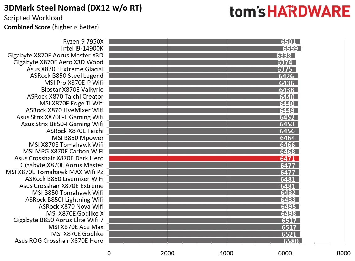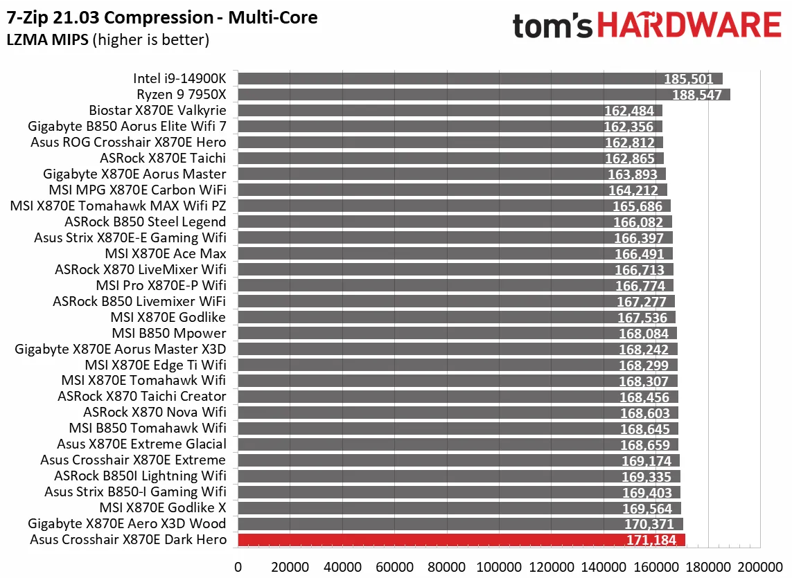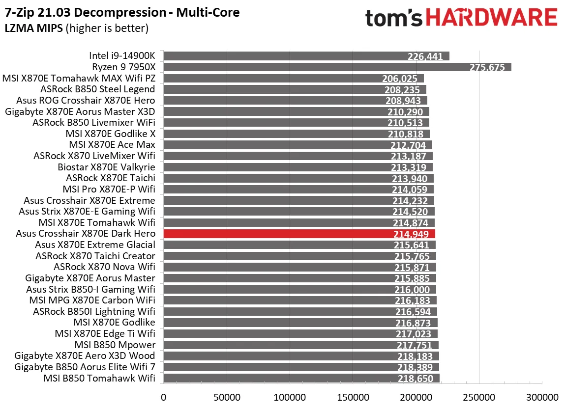 Начнём с синтетических тестов. Наша премиальная материнская плата среднего класса X870E Dark Hero показала результаты на уровне или чуть выше среднего по сравнению с аналогами. В некоторых дисциплинах, например, в архивации 7-Zip, она оказалась самой быстрой, а в других, как Cinebench, — чуть выше среднего. В остальных тестах она держалась в золотой середине, редко опускаясь ниже. Это стандартная картина для большинства материнских плат, так что пока поводов для беспокойства нет.