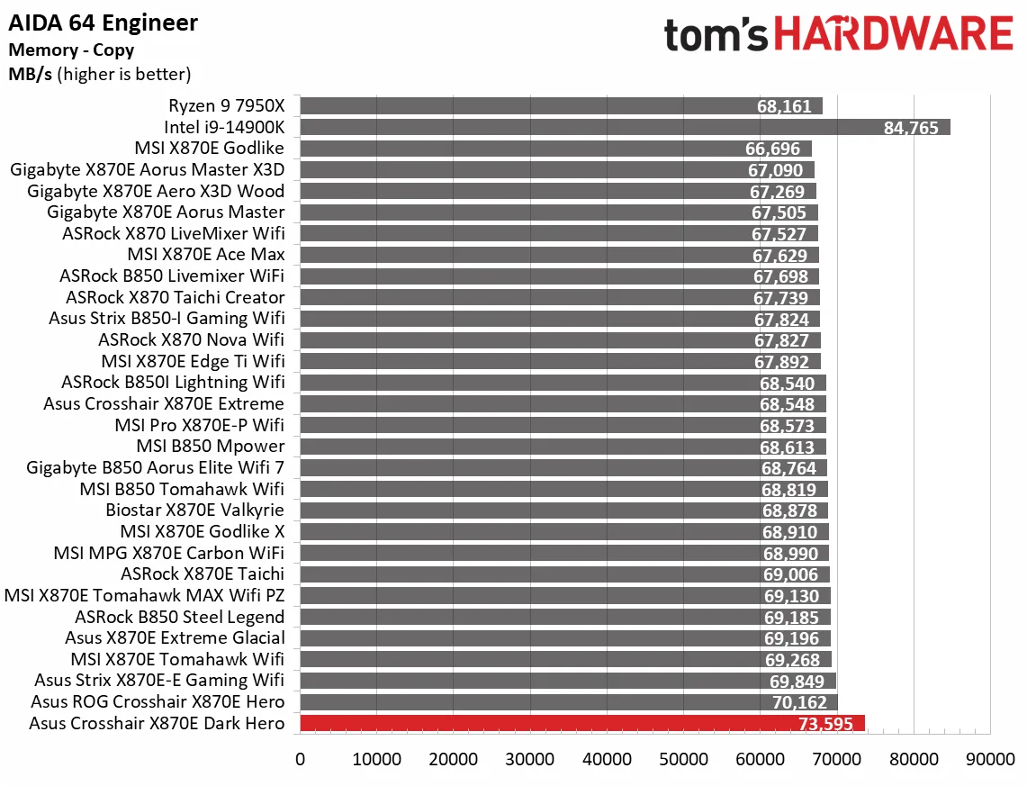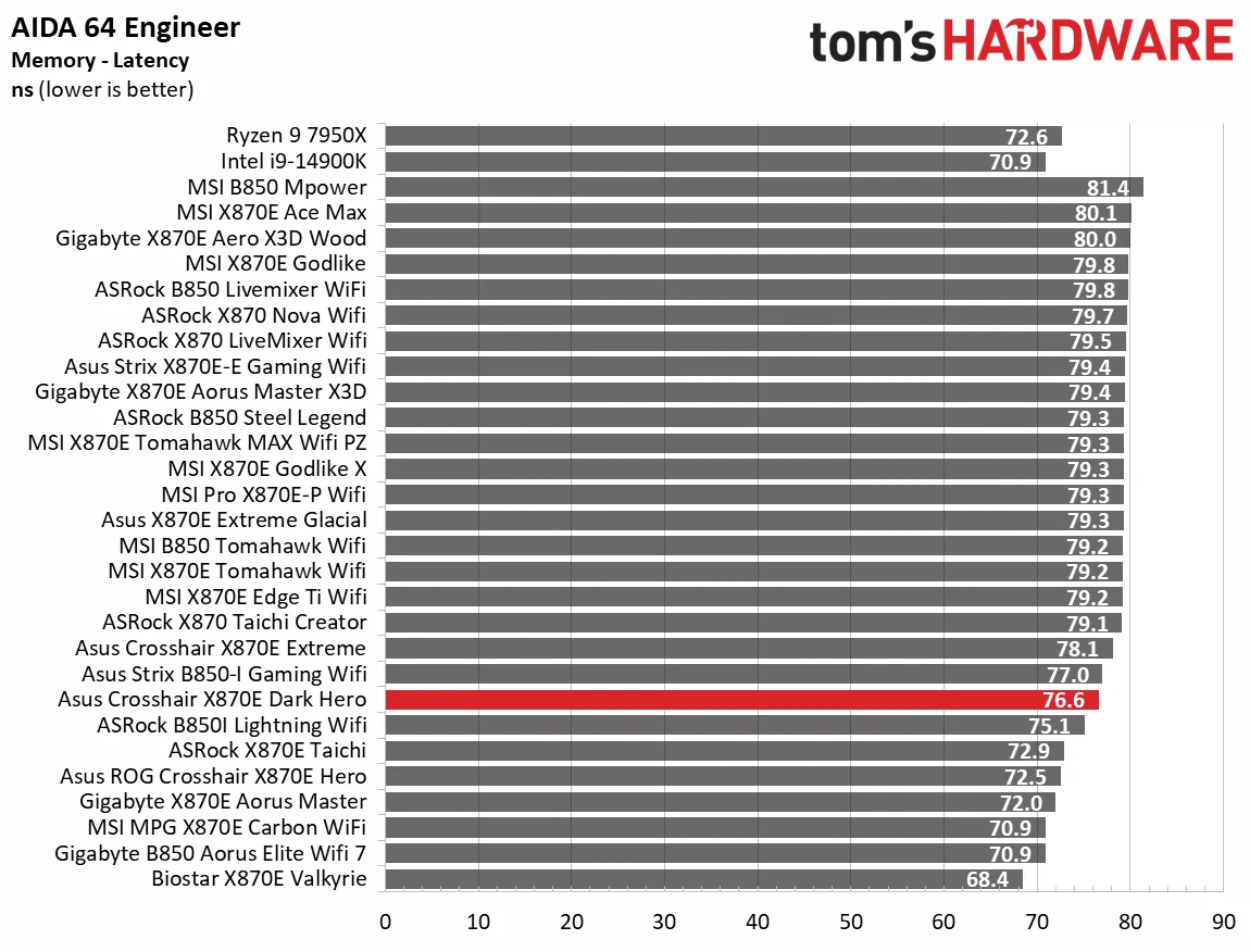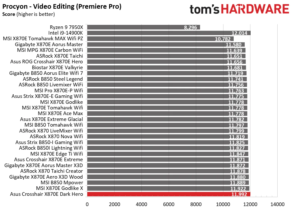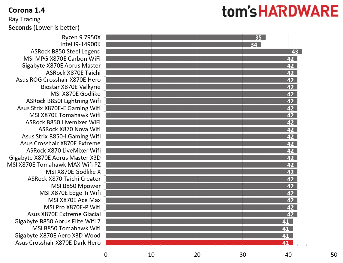 Начнём с синтетических тестов. Наша премиальная материнская плата среднего класса X870E Dark Hero показала результаты на уровне или чуть выше среднего по сравнению с аналогами. В некоторых дисциплинах, например, в архивации 7-Zip, она оказалась самой быстрой, а в других, как Cinebench, — чуть выше среднего. В остальных тестах она держалась в золотой середине, редко опускаясь ниже. Это стандартная картина для большинства материнских плат, так что пока поводов для беспокойства нет.