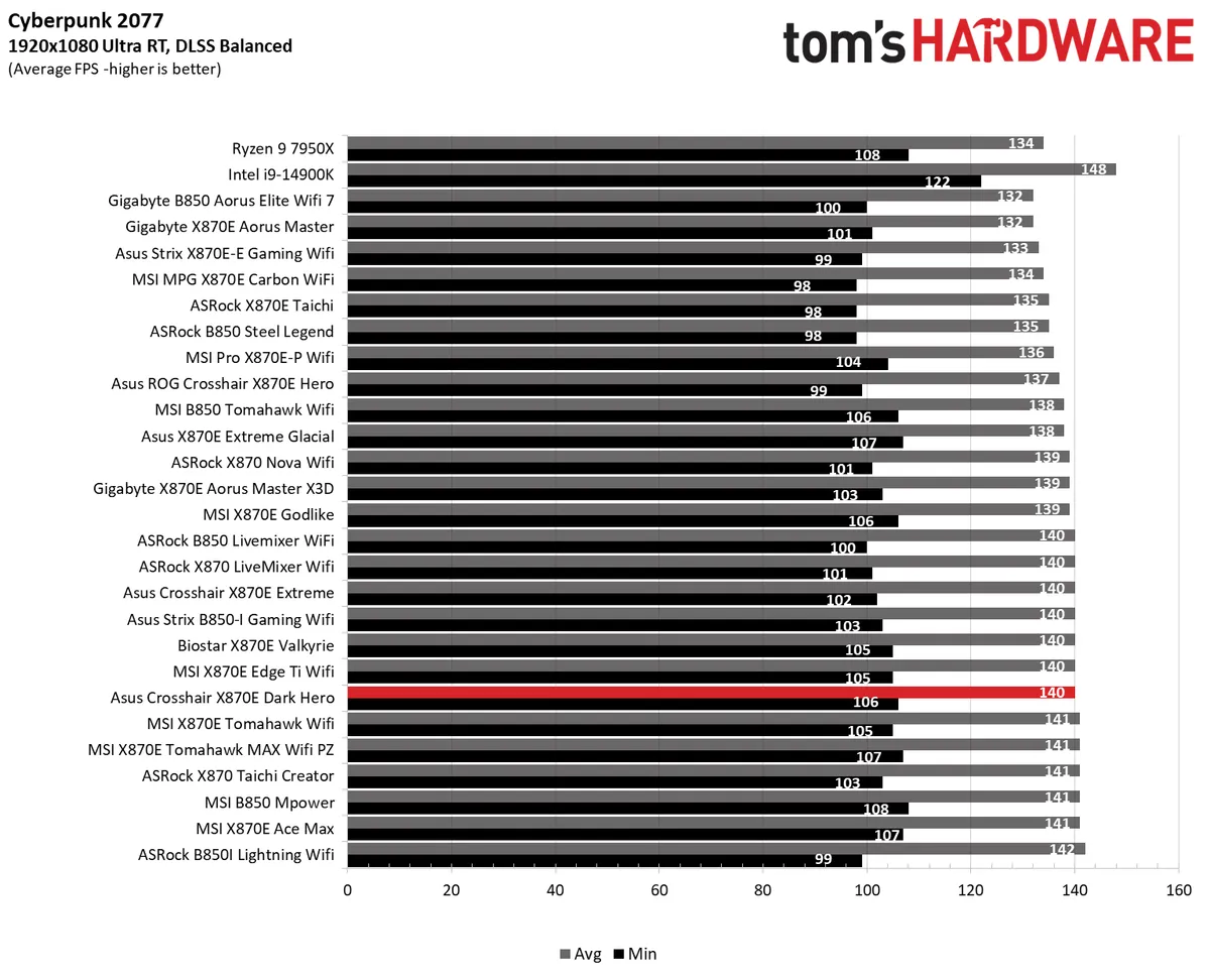 Цель этих тестов — увидеть, есть ли разница в производительности в самом популярном (и самом зависимом от процессора/памяти) разрешении на тех настройках, которые выбирает большинство геймеров. Мы ожидаем, что разница между материнскими платами будет минимальной, в пределах погрешности. Мы также добавили замер минимального FPS, так как именно он влияет на плавность игрового процесса.