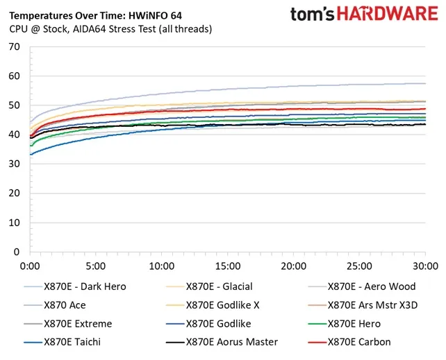 Температуры подсистемы питания (VRM) отличные. Пиковые значения едва достигали 51°C по данным нашего внешнего датчика и 57°C по данным внутреннего датчика Asus. Благодаря мощной системе питания и массивным радиаторам у вас не возникнет никаких проблем с разгоном флагманских процессоров или недавно вышедшего Ryzen 7 9850X3D.