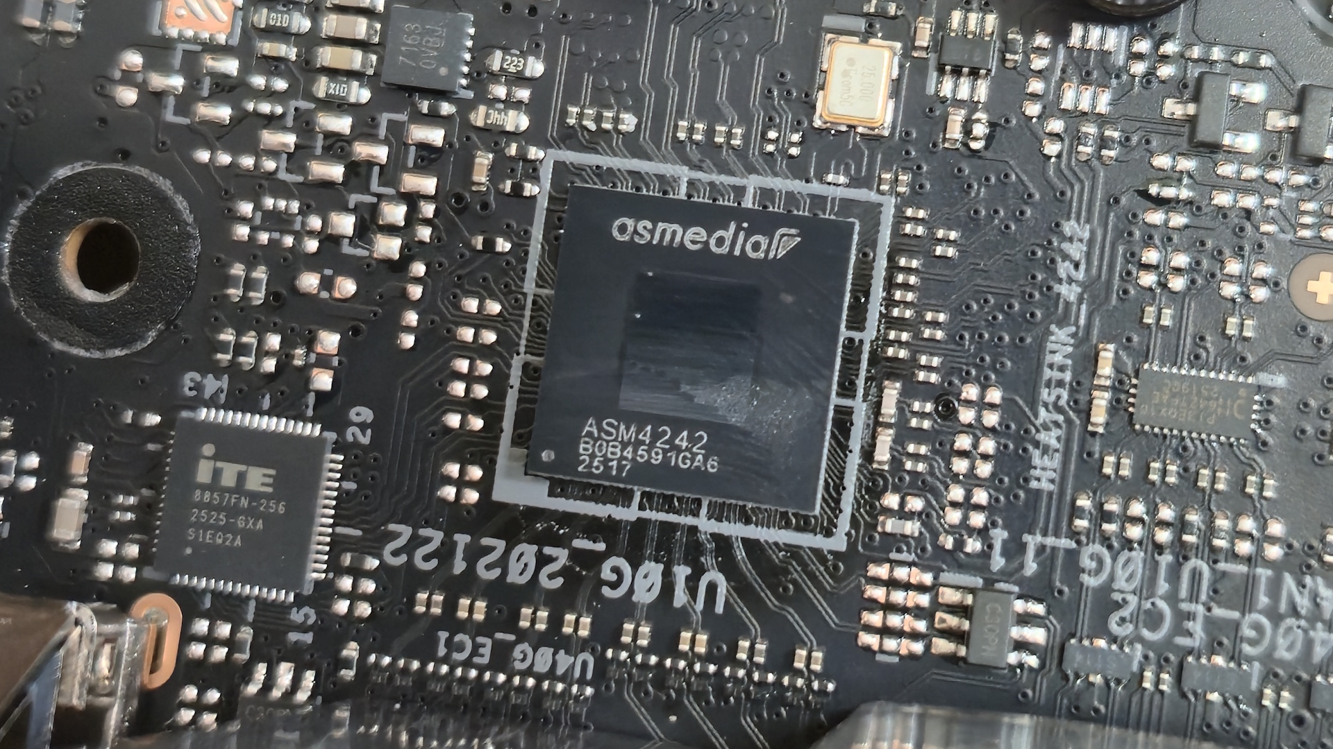 Выше отдельным блоком выделены шесть красных портов классического формата USB Type-A (все на 10 Гбит/с). Ещё выше — два сетевых порта на 10 и 5 Гбит/с от Realtek, удобные коннекторы для быстрого подключения Wi-Fi антенны и скромный аудиоблок (два джека на 3,5 мм для наушников и микрофона плюс оптический выход). Кому-то шести портов Type-A может показаться маловато, особенно если вы ещё не перешли на периферию с Type-C, но это, пожалуй, единственная придирка к этой шикарной панели.