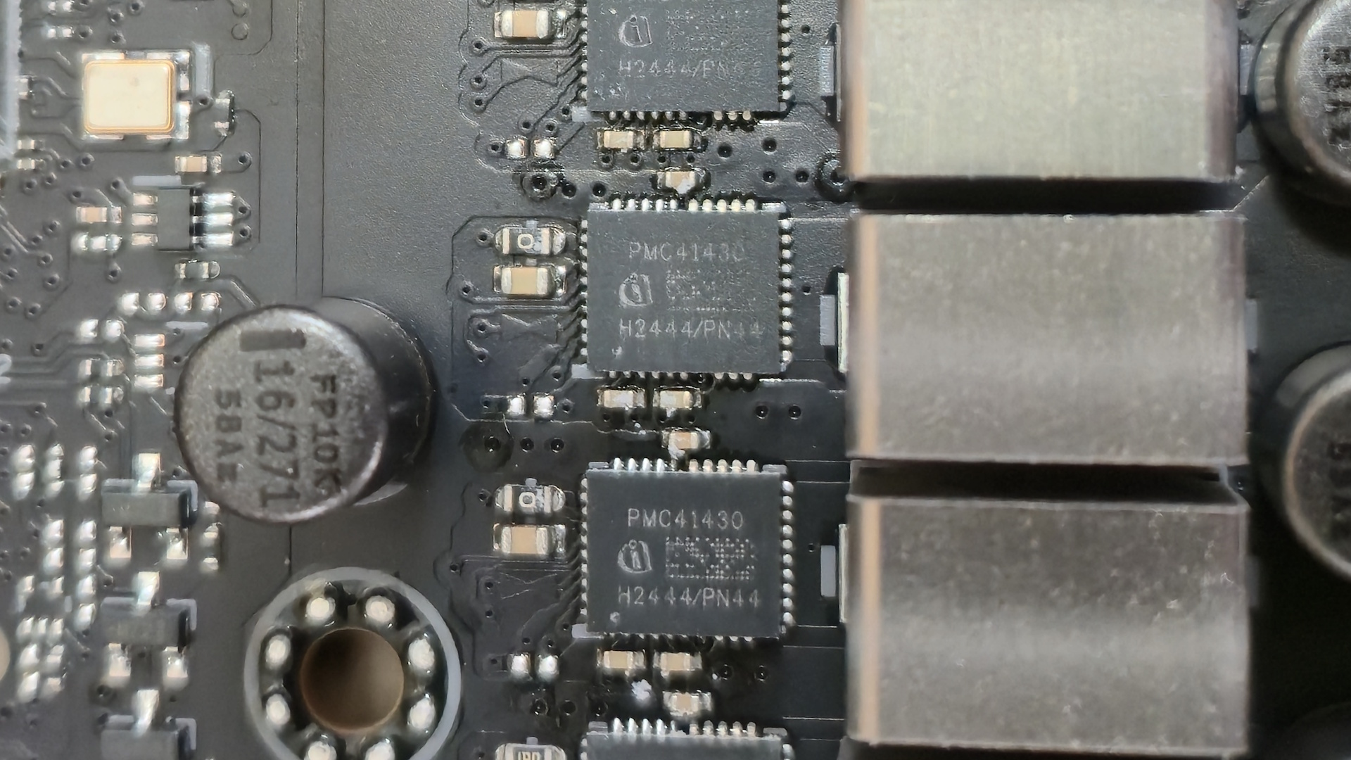 Спускаемся к нижней половине платы. Слева под стильным металлическим кожухом прячется топовый аудиокодек Realtek ALC4082 в паре с аудиофильским ЦАП и усилителем ESS 9219Q. Это максимум, что можно выжать из встроенного звука на сегодняшний день. Хотите чего-то большего — придётся покупать внешнюю аудиокарту за много денег.
