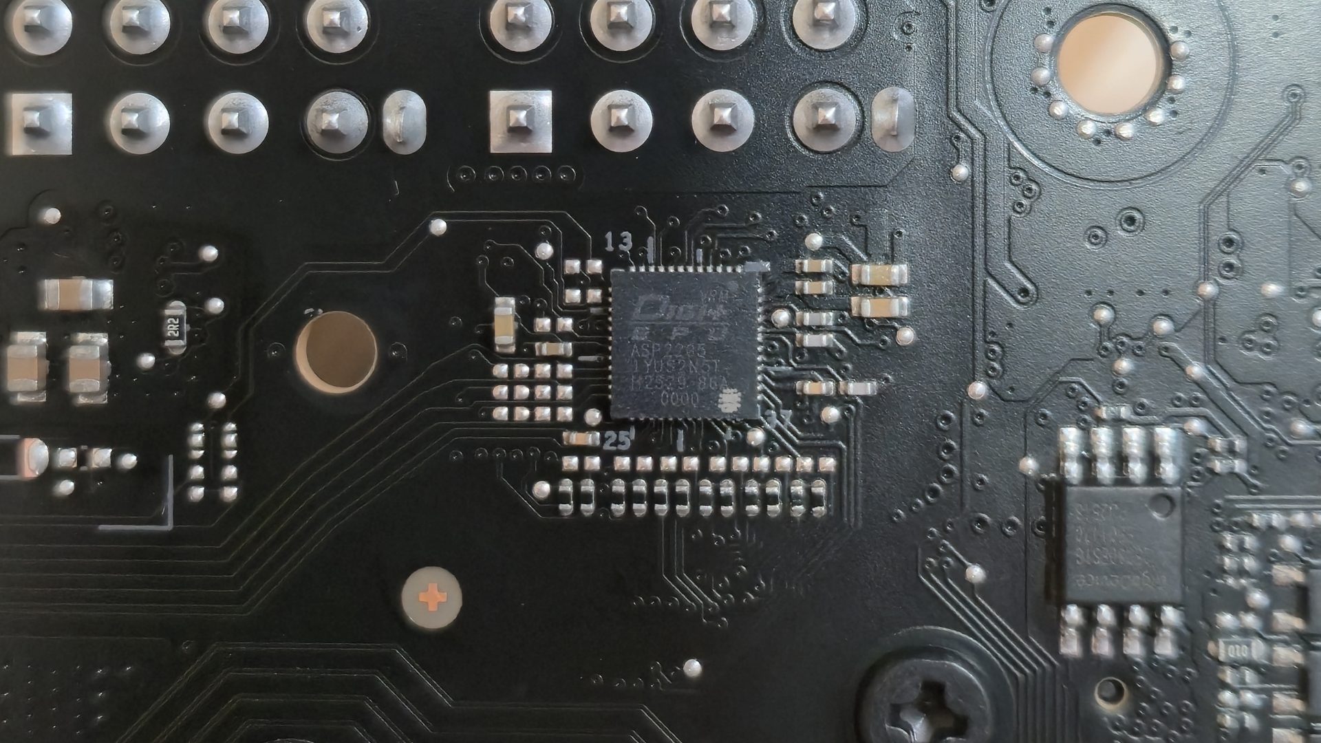 Справа от процессорного сокета распаяны четыре слота DDR5. Они используют усиленные контакты Nitropath и оснащены защёлками с обеих сторон. Asus заявляет поддержку до 256 ГБ оперативки на частотах вплоть до умопомрачительных DDR5-8600 для серии Ryzen 9000 и даже DDR5-9200 для процессоров со встроенной графикой (APU). Конечно, вряд ли кто-то в здравом уме будет ставить бюджетный APU в материнку за $700, если только речь не идёт об экстремальном оверклокинге для рейтингов Hwbot. Но запас прочности впечатляет.