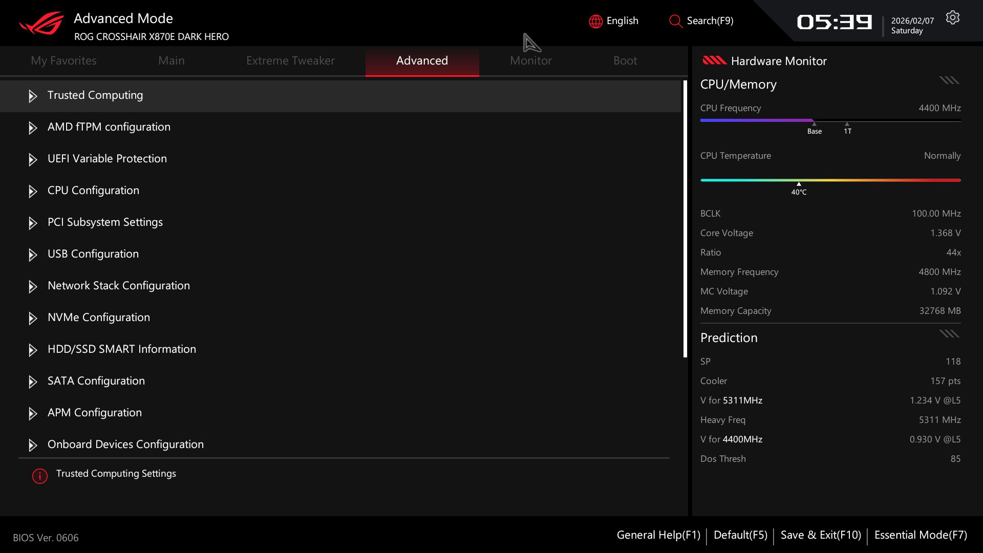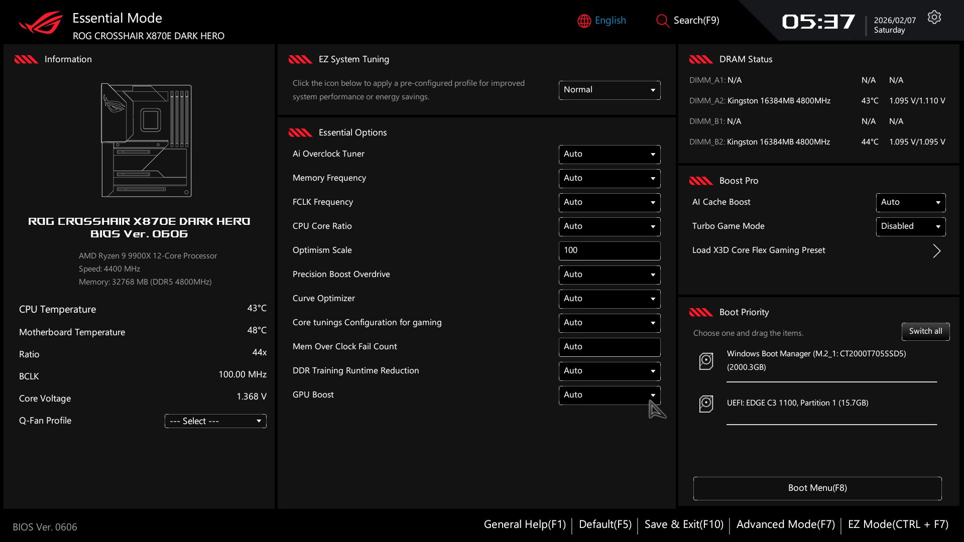 Для материнской платы X870E Dark Hero компания Asus обновила раскладку и цветовую гамму BIOS, взяв за основу знакомую тему ROG — чёрный текст на белом фоне с красными акцентами. Этот стиль идеально гармонирует с полностью чёрным дизайном самой платы. Режим EZ Mode по большей части информационный: слева отображаются системные данные и температуры, а по центру собраны быстрые настройки, такие как утилита прошивки EZ Flash, управление подсветкой Aura RGB, хаб для простой установки драйверов и многое другое. Чуть ниже находятся элементы управления вентиляторами и полный доступ к функциям Q-Fan. В блоке справа показан статус оперативной памяти и накопителей, а раздел Boot Priority говорит сам за себя.
