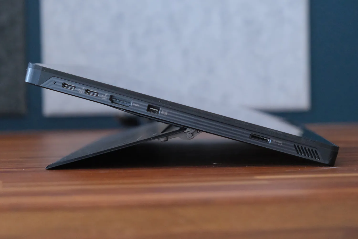 Вся конструкция Asus ROG Z13 Flow была вырезана на станке с ЧПУ из металла, что придаёт ей настоящую жёсткость, а прозрачный вырез теперь сделан из настоящего стекла, а не из пластика. Мне нравится, насколько прочная подставка, позволяющая регулировать планшет практически под любым углом, в том числе под экстремальным, который я нашёл идеальным для игры в покер-рогалик Balatro с помощью сенсорного экрана. Крышка клавиатуры крепится снизу с помощью зажимов и удерживается на месте сильными магнитами. Он сделан из искусственной кожи, которая приятна на ощупь и не оставляет следов во время тестирования.