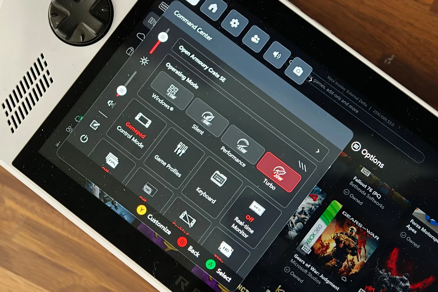Хотя программное обеспечение Armoury Crate SE от Asus все еще на борту, теперь оно в основном работает в фоновом режиме. Я открывал само приложение только для настройки RGB-подсветки, обновления драйверов и настройки задних кнопок. Все остальное можно сделать из оверлея быстрых настроек, либо через Game Bar, либо напрямую с помощью горячей клавиши. Это включает в себя такие важные вещи, как изменение режима питания, разрешения, частоты обновления и яркости экрана. Жаль, что оверлей с показателями производительности мешал закрывать окна на рабочем столе. Это один из примеров того, какие еще мелкие доработки нужны, чтобы консоль ощущалась такой же отполированной, как Steam Deck.