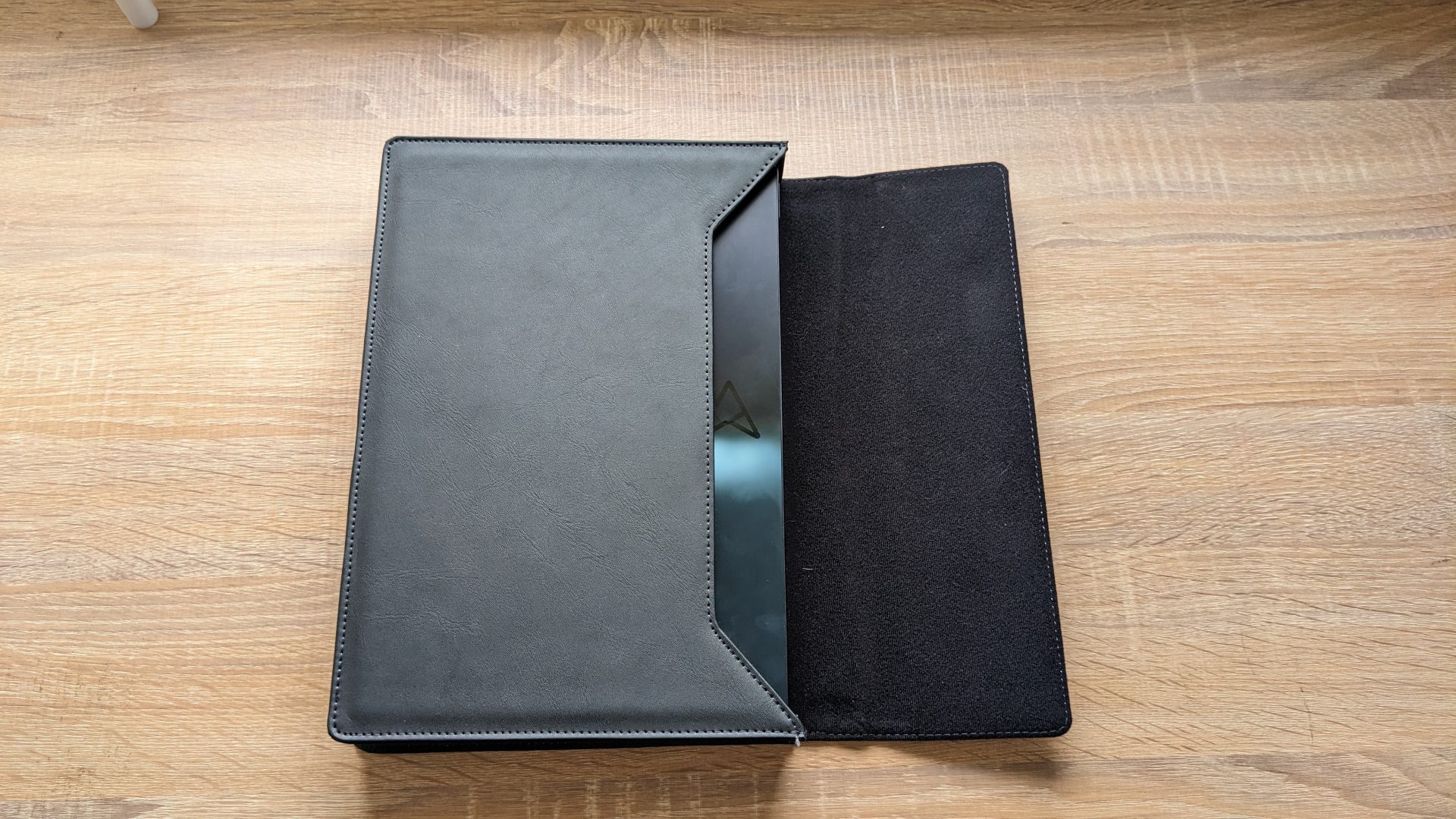 Внешне, можно сказать, что Zenbook Fold 17 OLED выглядит и ощущается превосходно. Отделка корпуса представляет собой сочетание отражающего матового металла и кожзаменителя, который обхватывает заднюю часть шарнира и крепление, которое само по себе кажется очень прочным. На двух краях имеются маленькие резиновые ножки, обеспечивающие сцепление с плоской поверхностью независимо от ее конфигурации.