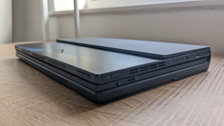 Разумеется, яркие цвета — это не все, что может предложить этот экран. Благодаря сдвижной задней панели и скрытому шарниру, вы можете сложить дисплей и прикрепить клавиатуру магнитами к нижней половине, превратив его в более компактный 12,5-дюймовый «обычный» ноутбук. В качестве альтернативы можно снять клавиатуру и разделить дисплей на две части на шарнире или развернуть его горизонтально, чтобы получить подобие «книги».