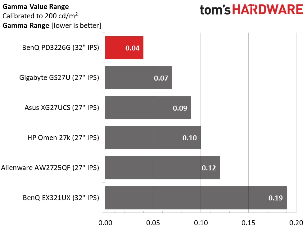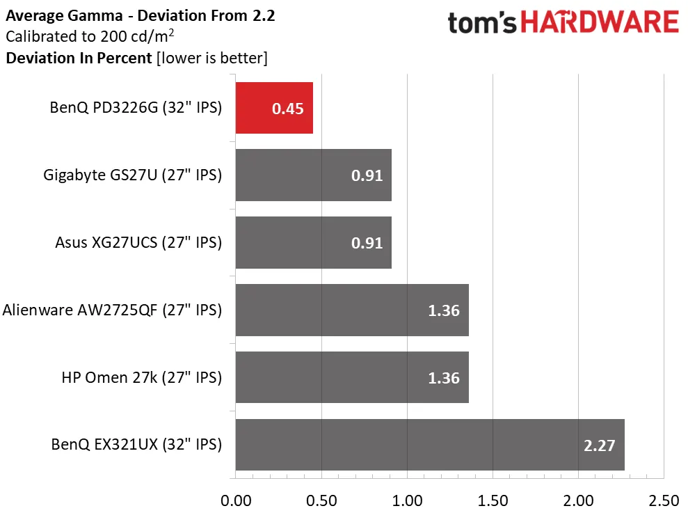Гамма-отслеживание PD3226G — одно из лучших, что я видел на сегодняшний день. Диапазон значений составляет всего 0,04, а отклонение от идеальных 2,2 составляет лишь 0,45% (фактическое среднее значение — 2,19). Лучше и быть не может.
