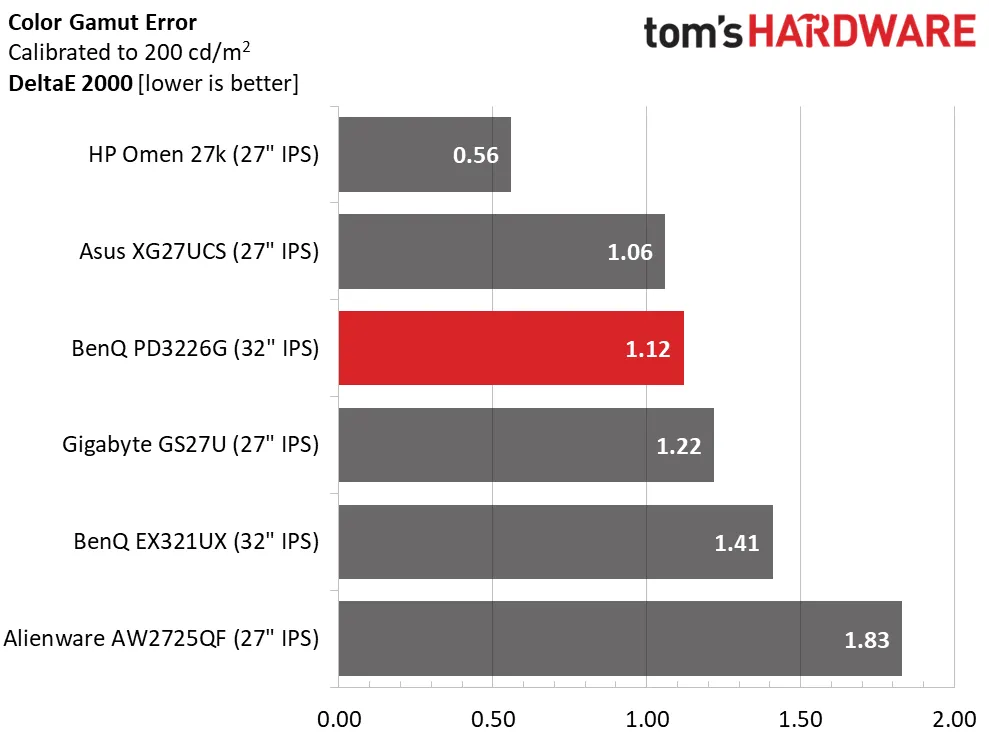 Итоговая погрешность PD3226G после настройки составляет 1,12 dE, что практически идеально. Некоторые мониторы, например HP Omen 27k, демонстрируют погрешность ниже 1 dE, но визуально при просмотре контента на всех шести экранах разницу заметить невозможно. PD3226G — это дисплей профессионального уровня с соответствующей точностью цветопередачи.