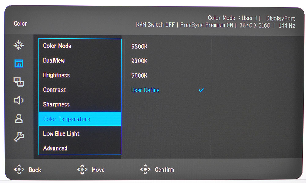 Функция DualView позволяет сравнивать два режима одновременно (разделяя экран пополам), что очень удобно для цветокоррекции. Остальная часть меню содержит традиционные настройки яркости, цвета, три варианта цветовой температуры и гаммы.