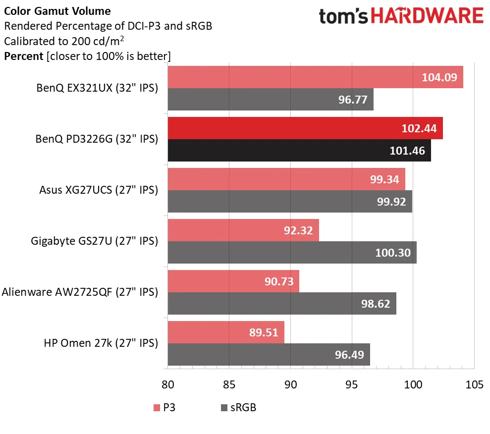 Это идеальные показатели: охват не слишком высокий и не слишком низкий. Такой баланс обеспечивает оптимальное изображение без компромиссов при цветокоррекции и мастеринге контента. PD3226G справляется с этими задачами с высокой точностью, будь то игры или видеомонтаж.