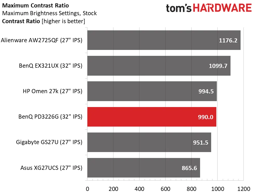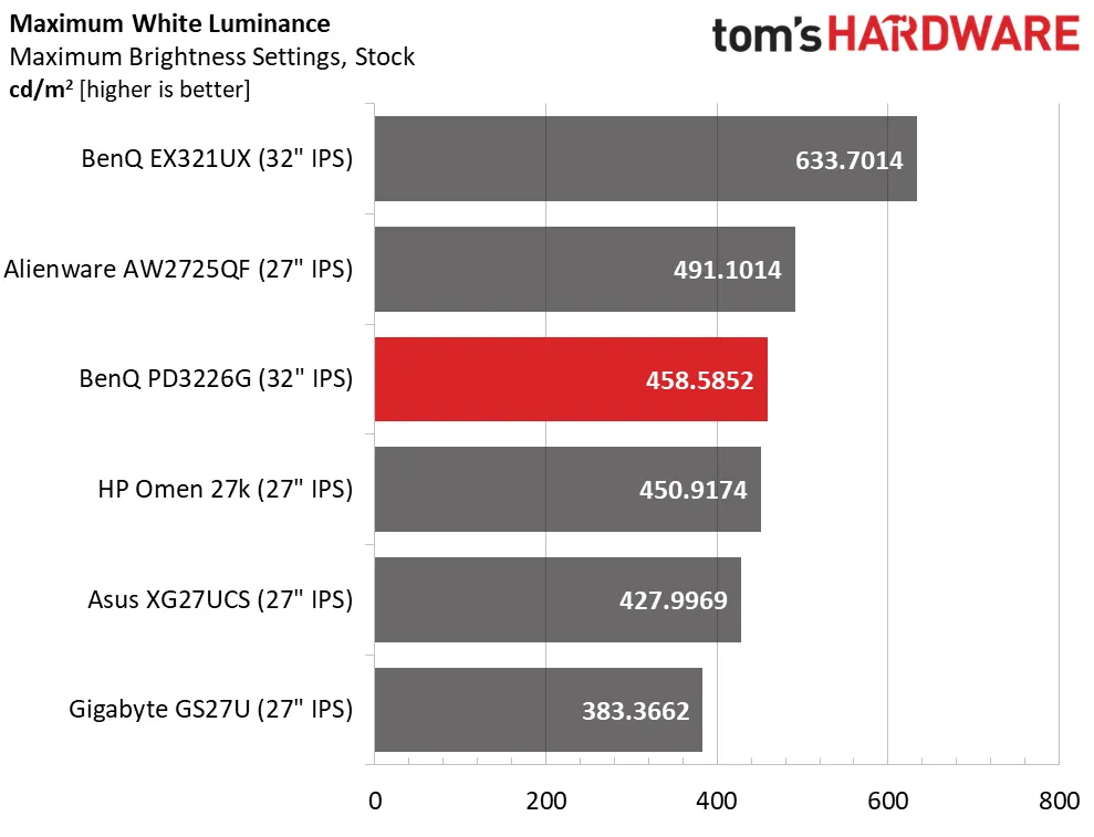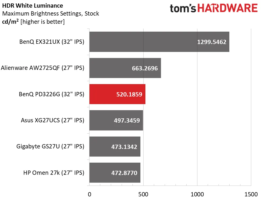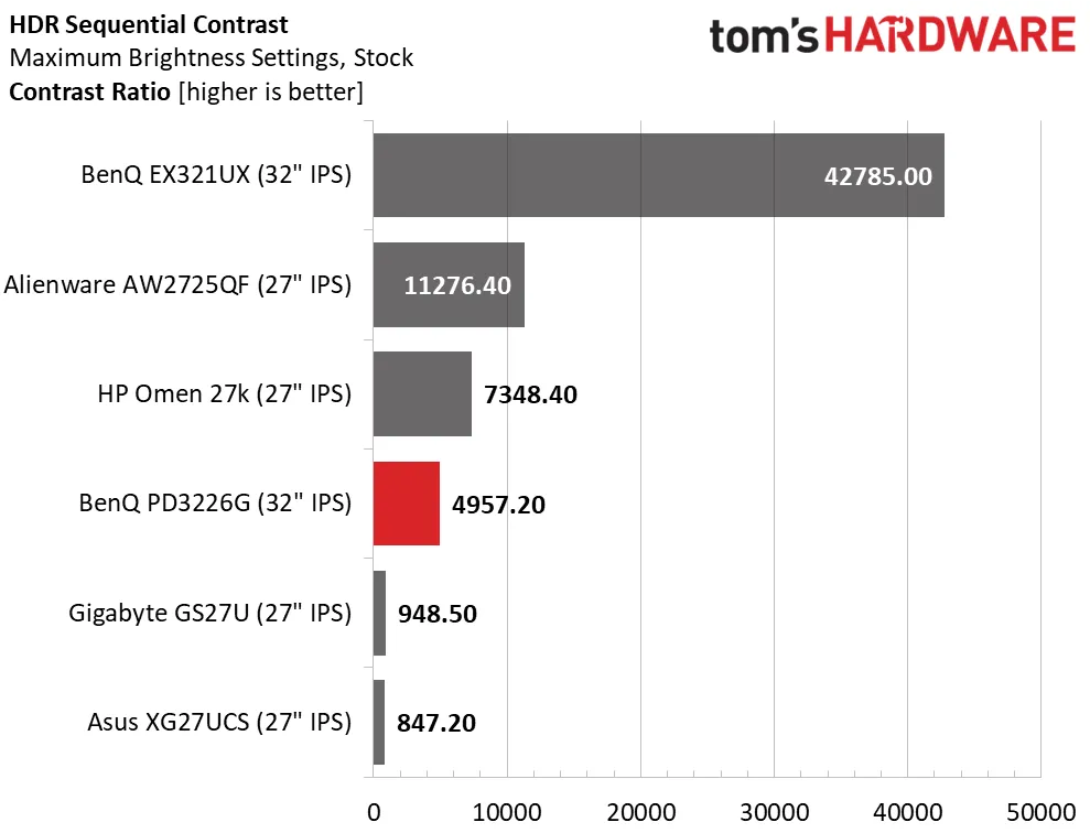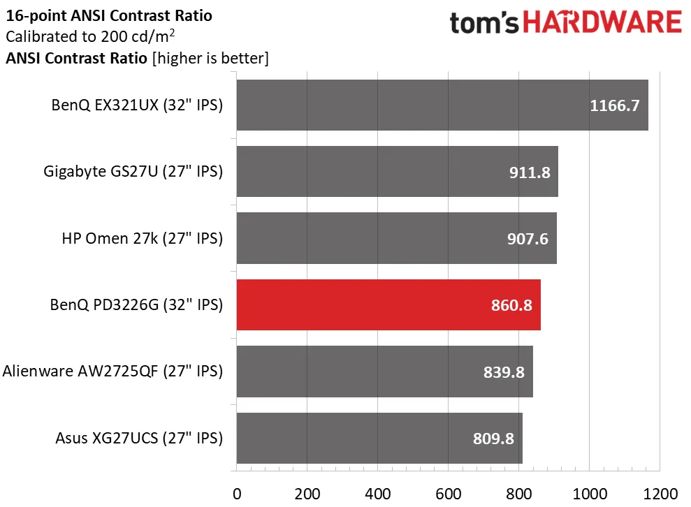 В тесте ANSI монитор занял позицию ровно в середине списка, показав результаты, очень близкие к конкурентам (за исключением модели BenQ EX321UX, которая оснащена подсветкой Mini LED).
