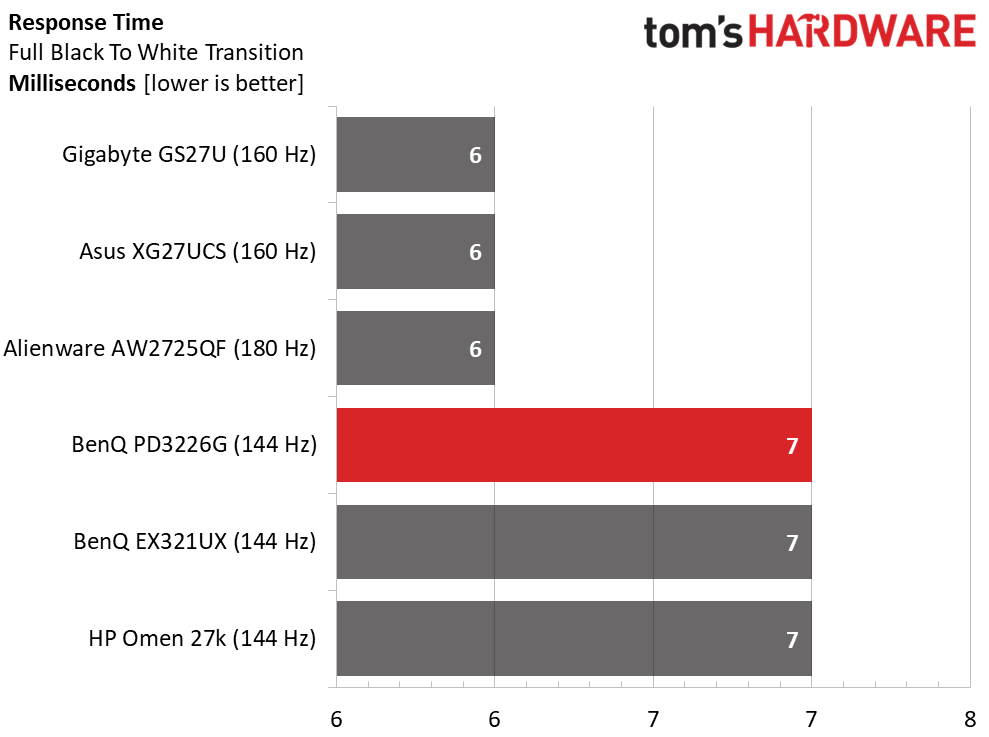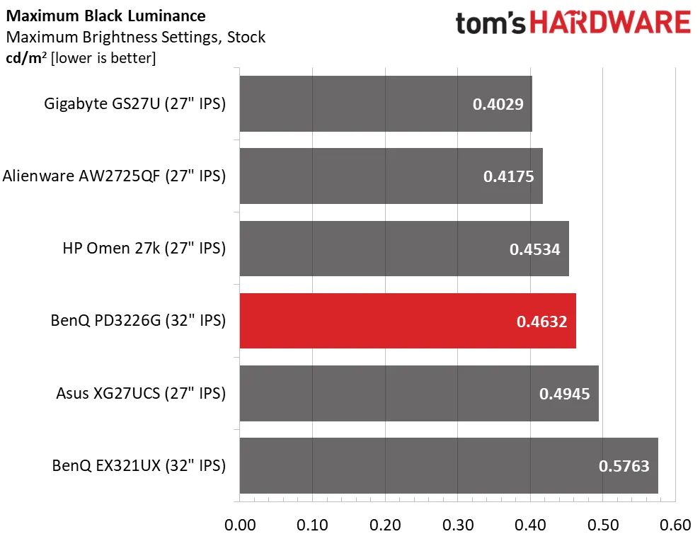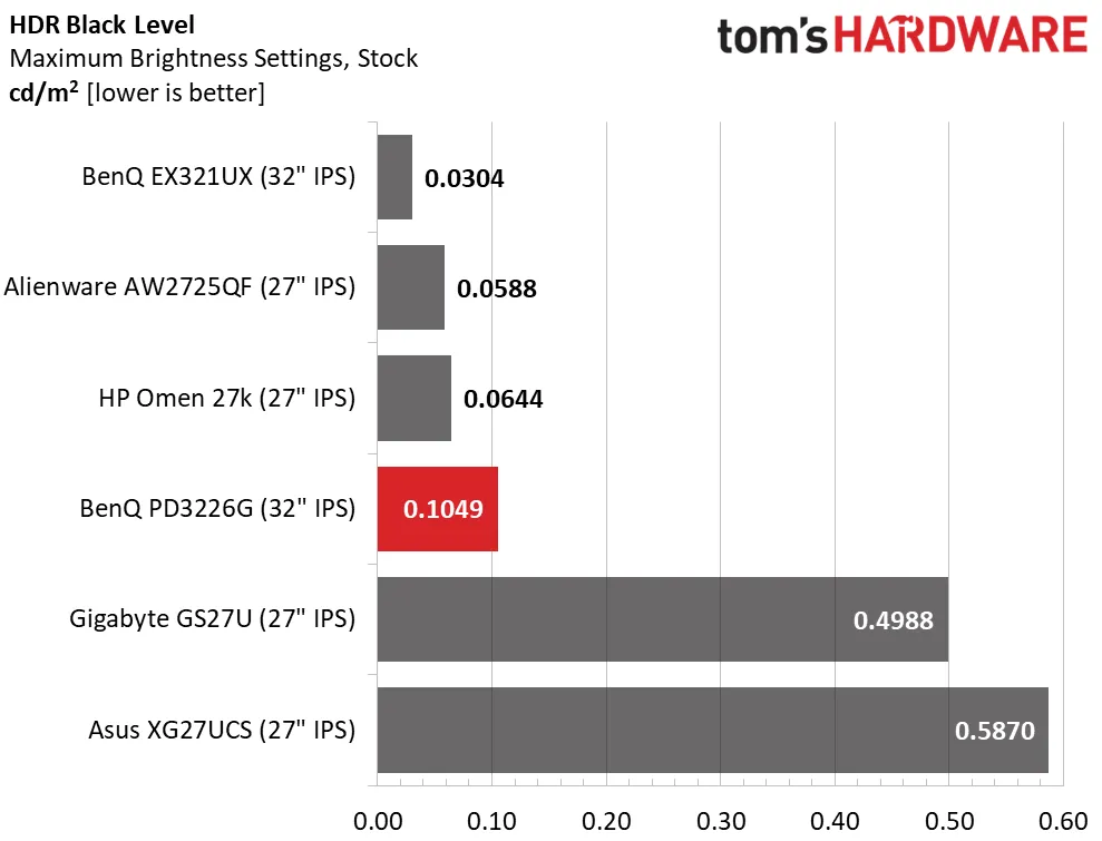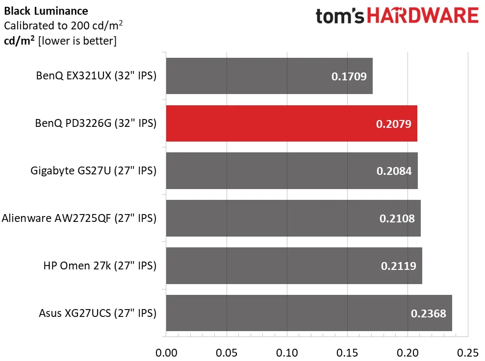В тесте ANSI монитор занял позицию ровно в середине списка, показав результаты, очень близкие к конкурентам (за исключением модели BenQ EX321UX, которая оснащена подсветкой Mini LED).