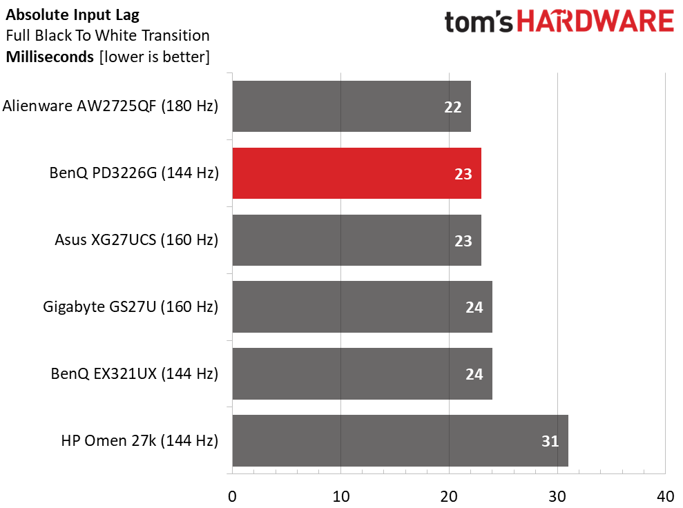 Задержка ввода также оказалась меньше, чем я ожидал. PD3226G всего на 1 мс медленнее Alienware с частотой 180 Гц и не уступает (или даже превосходит) два монитора с частотой 160 Гц. Хотя OLED-дисплей по-прежнему остаётся лучшим выбором для соревнований, PD3226G достаточно быстр и удовлетворит потребности всех, кроме, пожалуй, самых опытных профессиональных игроков.
