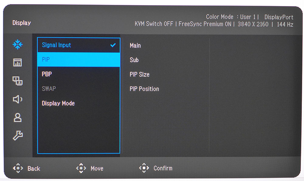 В меню «Сигнал» есть селектор входов, а также настройки PIP/PBP («картинка в картинке» и «картинка рядом с картинкой»), позволяющие просматривать два источника одновременно.