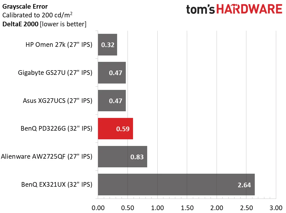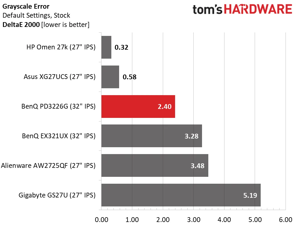 Погрешность цветопередачи «из коробки» у PD3226G находится ниже порога видимости (среднее значение 1,92 dE), но небольшой потенциал для улучшения всё же есть. Вторичные цвета немного искажены, однако это исправляется калибровкой оттенков серого.