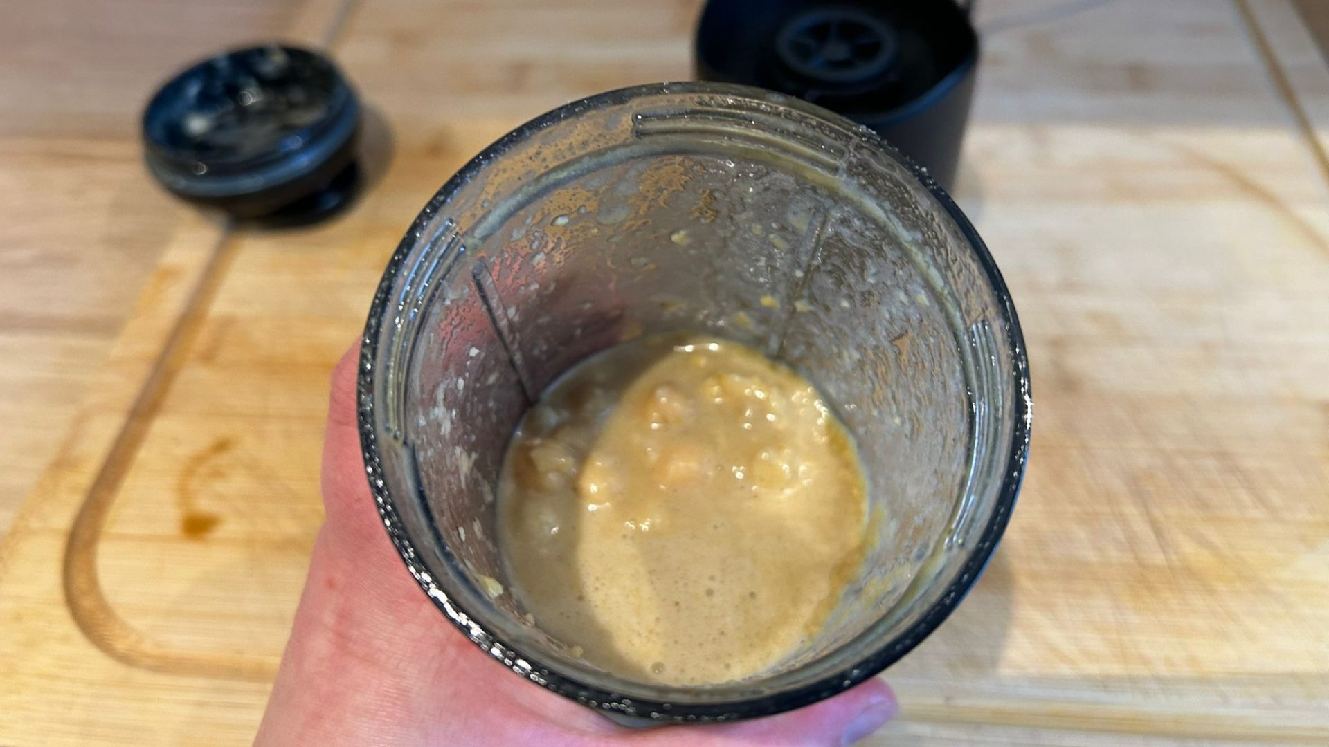Я протестировала рецепт хумуса от Nutribullet, снова уменьшив количество ингредиентов вдвое. Хотя нижняя часть ингредиентов после одного цикла смешалась довольно хорошо, верхняя осталась нетронутой. Блендер с трудом справлялся с густотой хумуса, в какой-то момент остановившись, несмотря на мои попытки разбавить смесь. Аналогично, прибор с трудом справлялся со льдом.