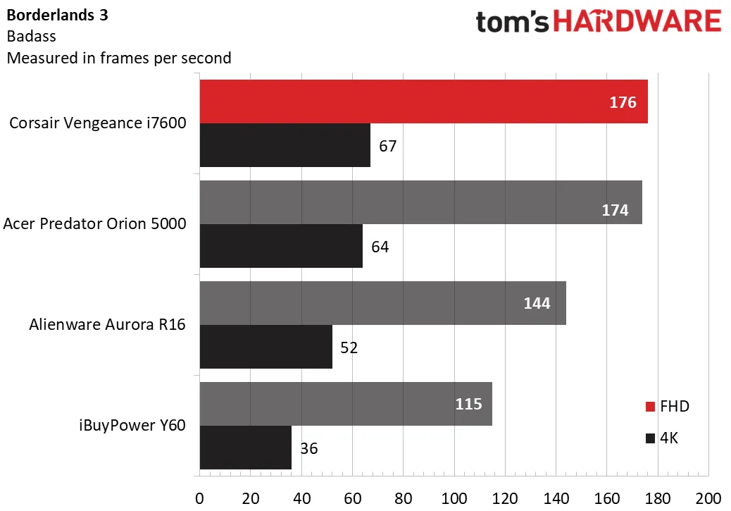 Наконец, в Borderlands 3 на пресет-настройке игры Badass процессор Vengeance i7600 незначительно превзошёл Acer: 176 кадров в секунду при разрешении 1080p и 67 кадров в секунду при разрешении 4K против 174 кадров в секунду при разрешении 1080p и 64 кадров в секунду при разрешении 4K у Acer.
