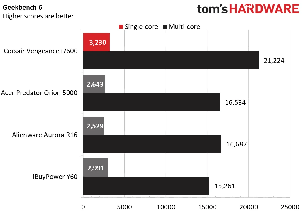 Процессор Vengeance i7600 показал лучшие результаты в синтетическом тесте Geekbench 6, набрав 3230 баллов в одноядерном режиме и 21 224 балла в многоядерном. Acer занял второе место с результатом 2643 балла в одноядерном режиме и 16 534 балла в многоядерном. Alienware показал результаты, аналогичные Acer, в то время как iBuyPower, оснащённый процессором Ryzen 7 7700X, занял последнее место в многоядерном тесте, но показал хорошие результаты в одноядерном тесте.