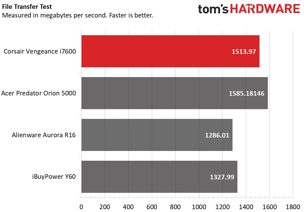 Мы также провели тест на передачу файлов размером 25 ГБ на основном накопителе. Corsair оказался не таким быстрым, как Acer: средняя скорость передачи данных составила 1513,97 МБ/с по сравнению с 1585,18 МБ/с у Acer. iBuyPower занял третье место с показателем 1327,99 МБ/с, а Alienware — последнее с показателем 1286,01 МБ/с.