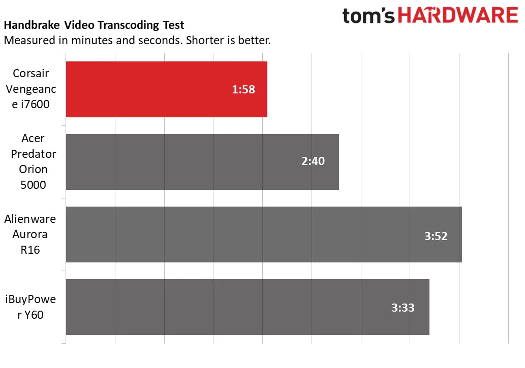 В нашем тесте Handbrake, в котором видео в формате 4K перекодируется в формат 1080p, Vengeance i7600 снова занял первое место, выполнив тест за 1 минуту 58 секунд. Acer отстал на 2 минуты 40 секунд, а Alienware (3 минуты 52 секунды) и iBuyPower (3 минуты 33 секунды) сильно отстали.