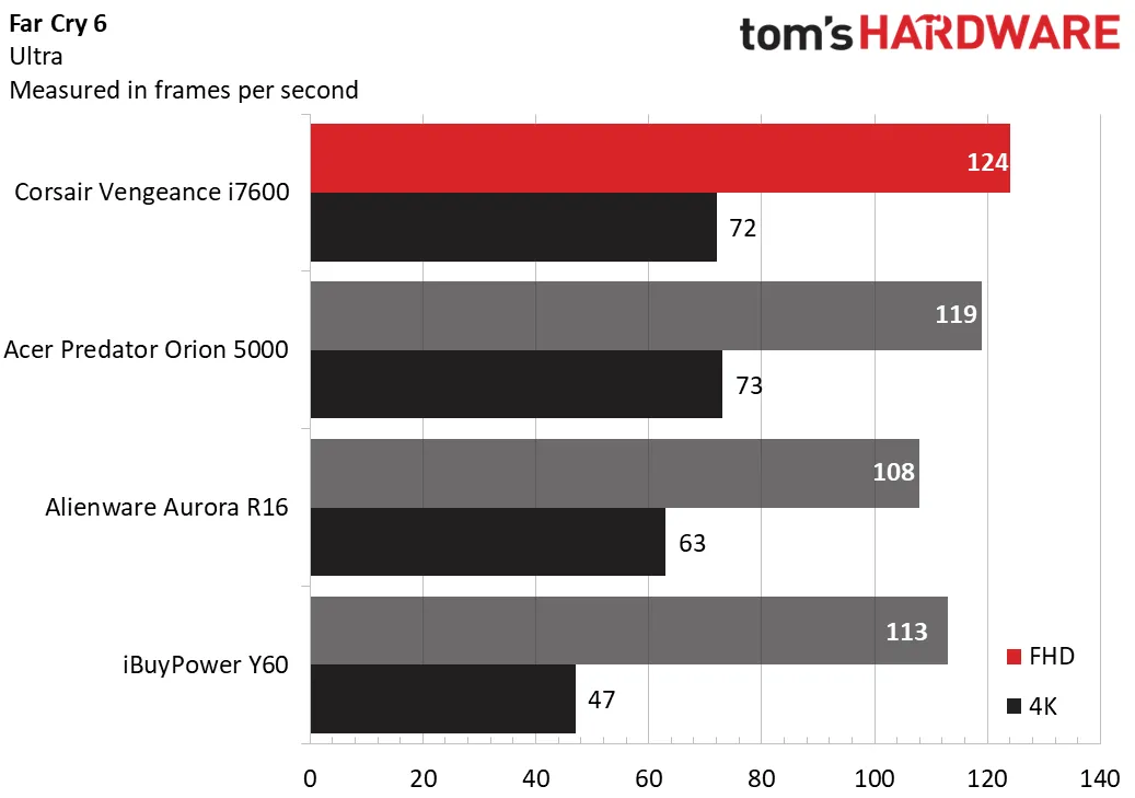 В Far Cry 6 на максимальных настройках системы Vengeance i7600 и Acer показали близкие результаты: Vengeance i7600 выдавал 124 кадра в секунду при разрешении 1080p и 72 кадра в секунду при разрешении 4K, а Acer — 119 кадров в секунду при разрешении 1080p и 73 кадра в секунду при разрешении 4K. Между тем Alienware выдавал 63 кадра в секунду при разрешении 4K, а iBuyPower — 47 кадров в секунду при разрешении 4K.