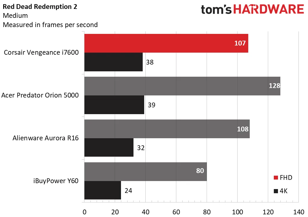 В Red Dead Redemption 2 при использовании средних настроек игры процессор Vengeance i7600 показал худшие результаты при разрешении 1080p, выдав 107 кадров в секунду по сравнению с 128 кадрами в секунду у Acer. При разрешении 4K системы показали одинаковые результаты: 38 кадров в секунду у Vengeance i7600 и 39 кадров в секунду у Acer. Системы Alienware и iBuyPower заняли третье и четвёртое места соответственно.