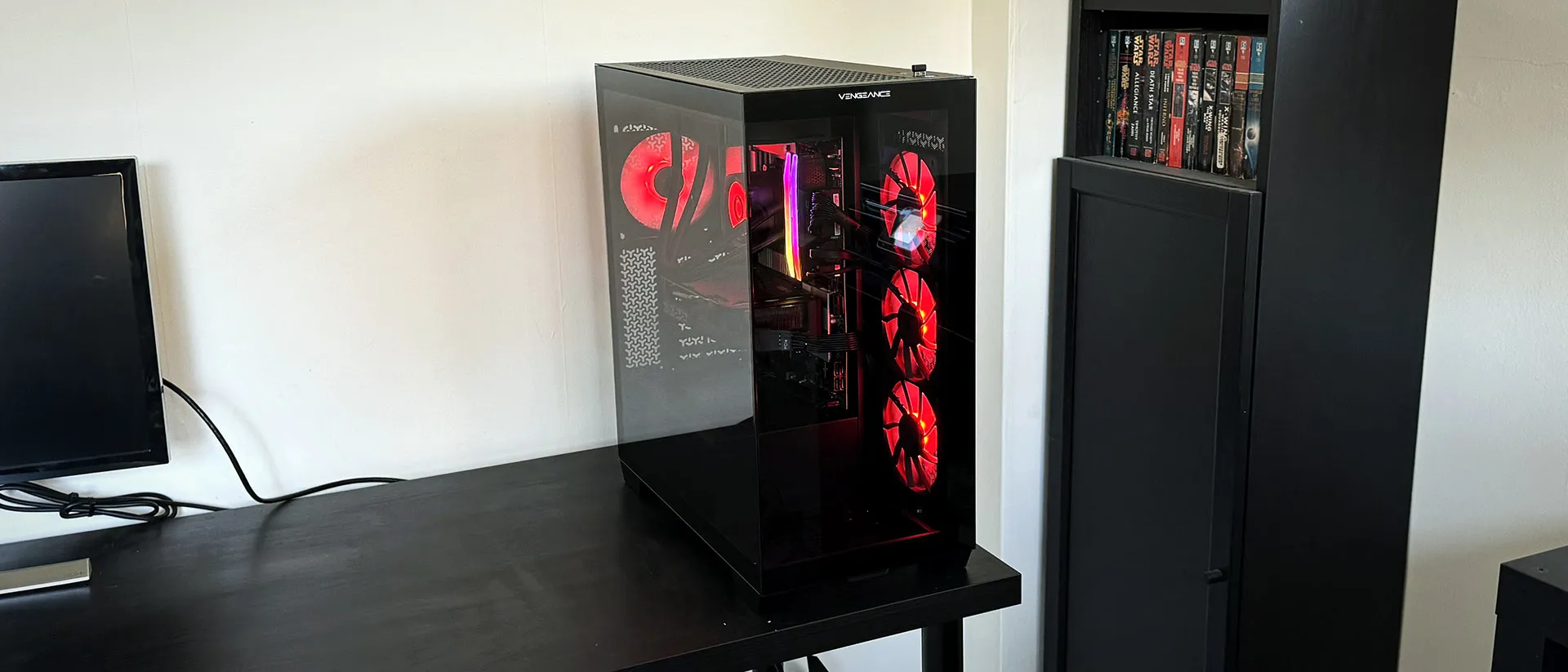В Vengeance i7600 используется корпус Corsair 3500X. Панели из закалённого стекла на передней и левой сторонах создают современную «аквариумную» эстетику, демонстрируя внутреннее пространство с RGB-подсветкой. Корпус выглядит дорого и премиально, что характерно для кастомных сборок.