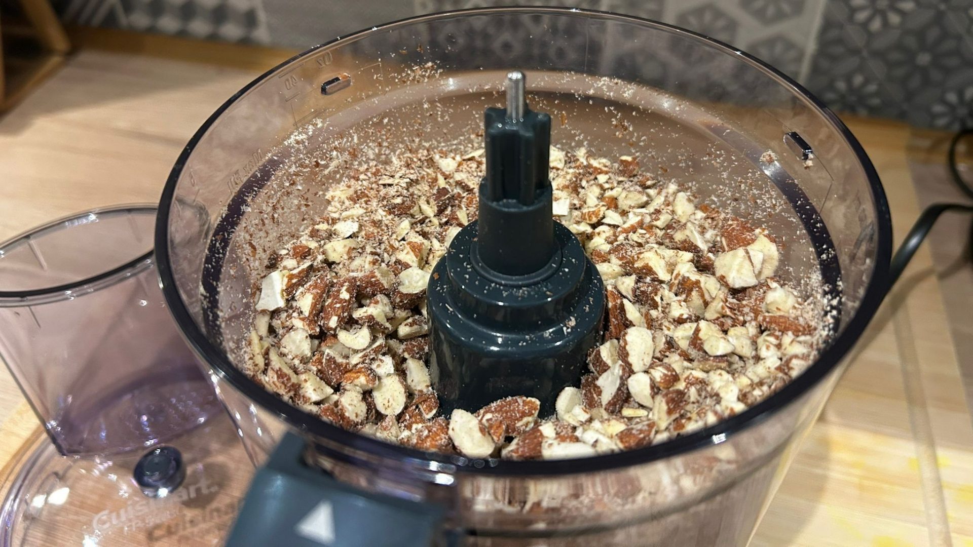 Проверив консистенцию, мы нажали кнопку «On», чтобы продолжить обработку и сделать миндальную пасту. Примерно через 10 секунд рубленый миндаль превратился в миндальную муку, но для получения масла потребовалось около шести минут. Проблема заключалась в том, что нижняя половина массы в чаше стала маслом, а верхняя — нет, и она не попадала на лезвия равномерно, даже когда мы использовали лопатку, чтобы счистить продукт со стенок (при выключенном приборе). В итоге внизу масло получилось очень твердым, а сверху — более мягким.
