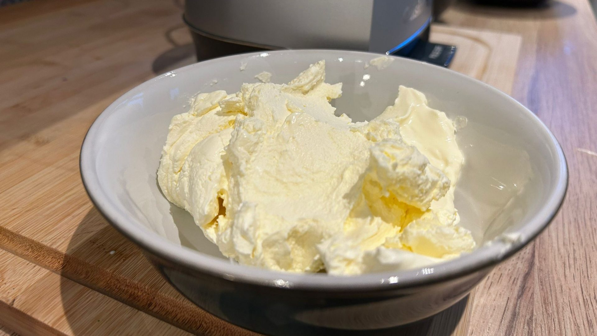 Наконец, мы протестировали диск для взбивания на 240 мл жирных сливок. Взбивание сливок может быть настоящей мукой, но этот комбайн создал идеально взбитые сливки (которые держали форму, если перевернуть емкость) примерно за 40–50 секунд. Хотя немного остатков застряло под диском и не перемешалось полностью, в целом мы остались довольны результатом.