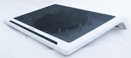 Поверхность, на которую устанавливается аппарат, представляет собой фигурную металлическую сетку, за которой расположен тихий, но производительный 13 см-вентилятор. Он создает внушительный воздушный поток, позволяюший охладить разгоряченный мобильный компьютер. Вентилятор использует подшипник скольжения с жизненным циклом 25 000 часов, а скорость оборотов вентилятора составляет 1000 об/мин. Для придания элегантности в рабочем состоянии вентилятор подсвечивается неяркими синими светодиодами. Для питания подставка использует USB-интерфейс.