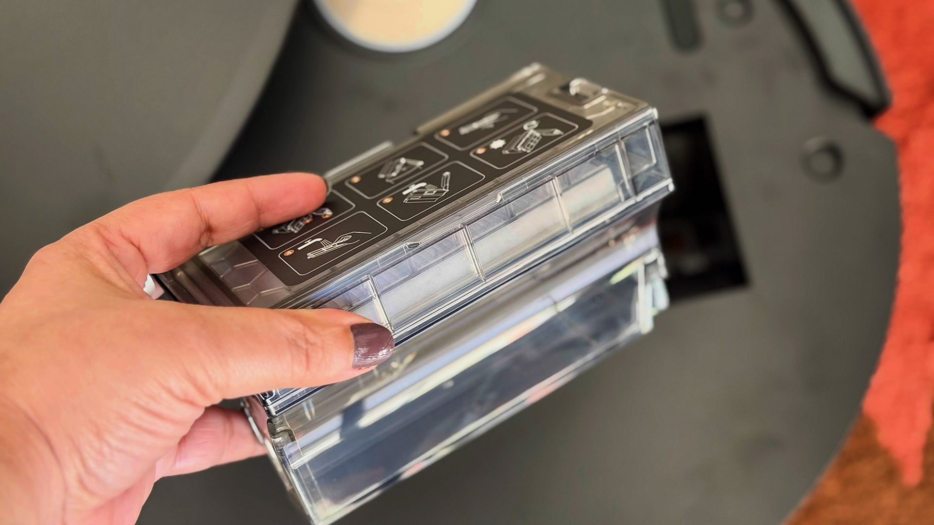 Верхняя крышка полностью снимается, открывая доступ к пылесборнику. Странно, но он намного меньше, чем у конкурентов — всего 220 мл. На мою уборку это не повлияло, но владельцам домашних животных придется опорожнять его чаще.