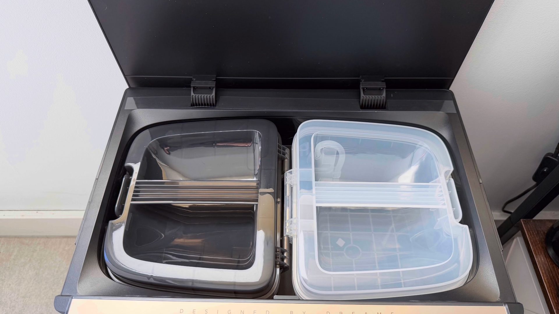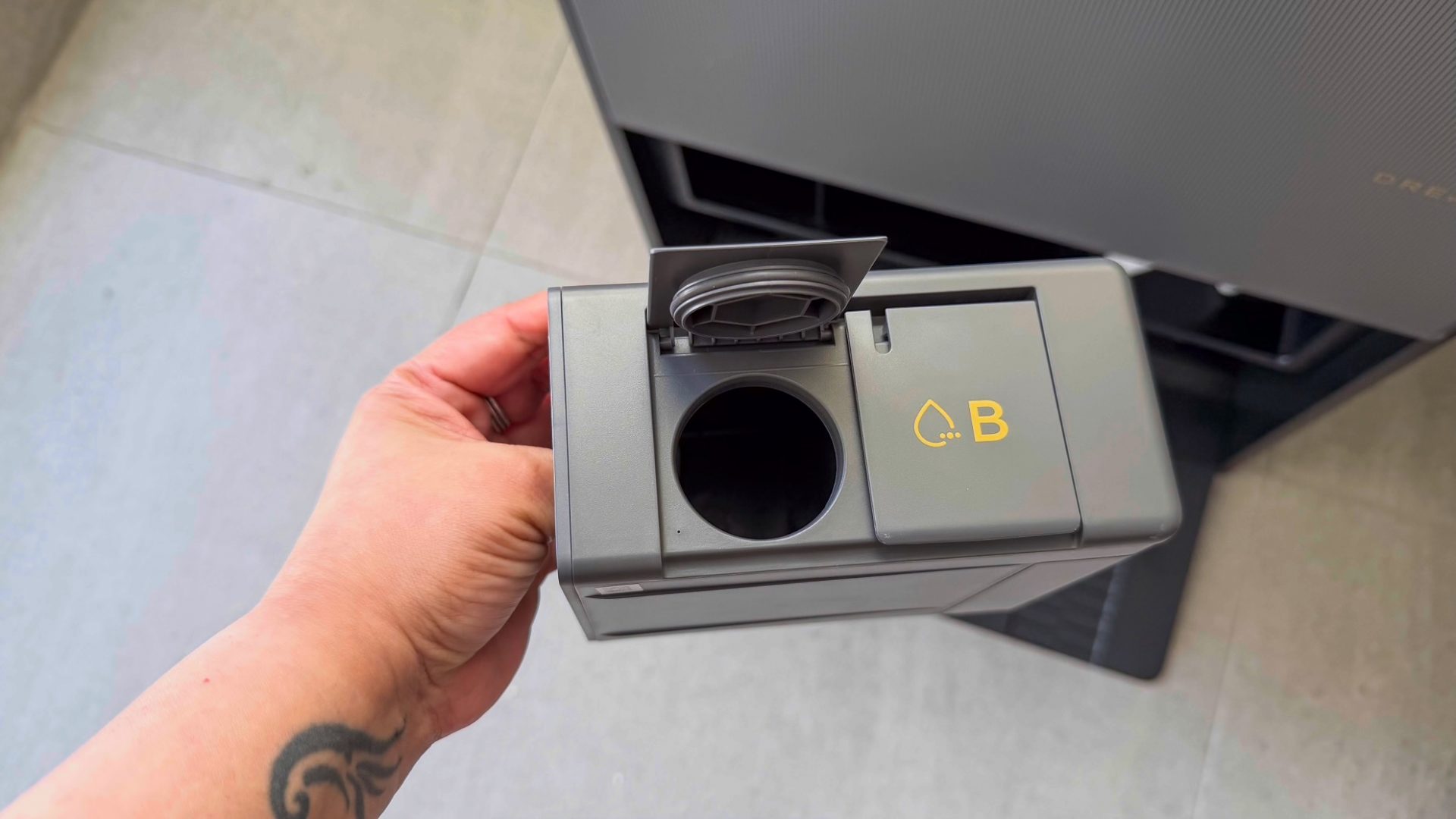 Дозатор имеет два отсека: для моющего средства и нейтрализатора запаха (оба идут в комплекте). Ручка для извлечения дозатора сделана под правую руку — левшам придется немного вывернуть запястье.