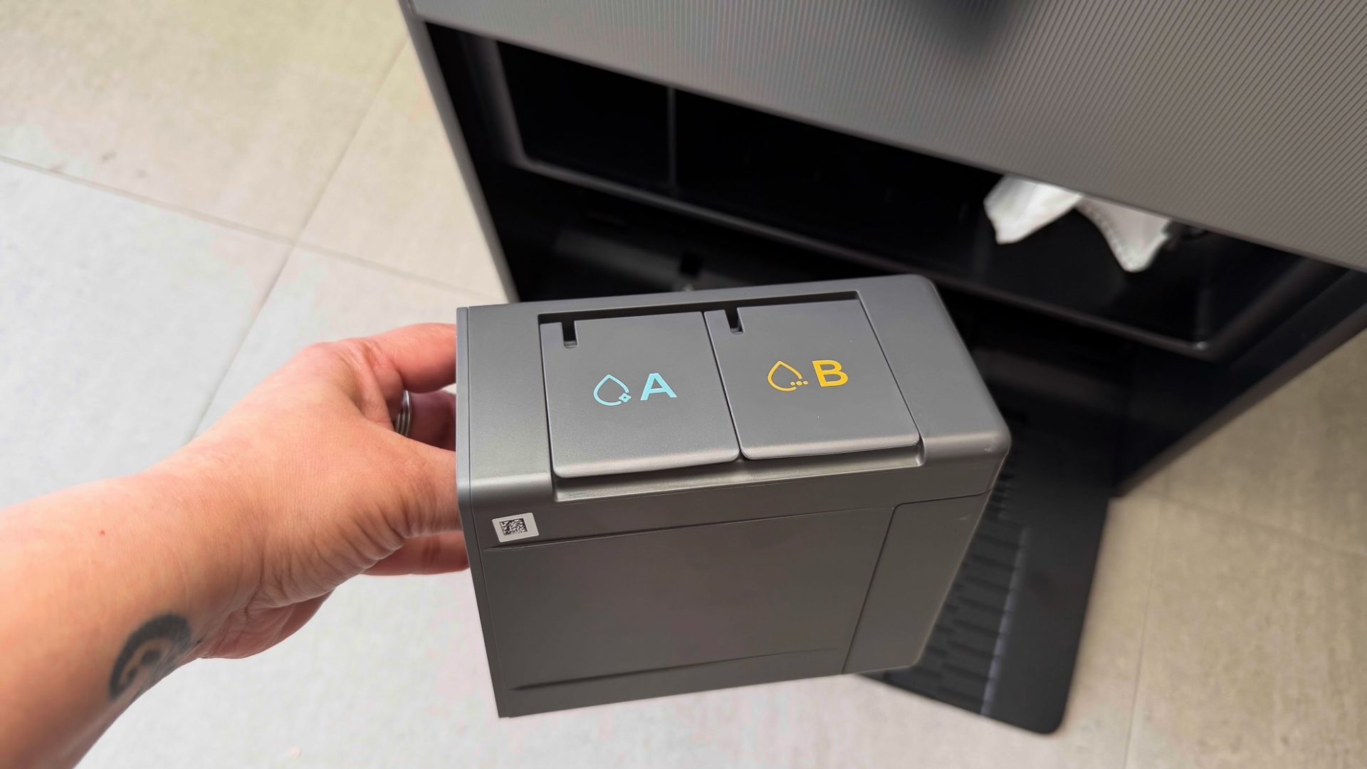 Под крышкой также находится индикатор Wi-Fi и QR-код для настройки. Будьте осторожны: на корпусе легко остаются отпечатки пальцев, которые трудно стереть (я придирчива, знаю).