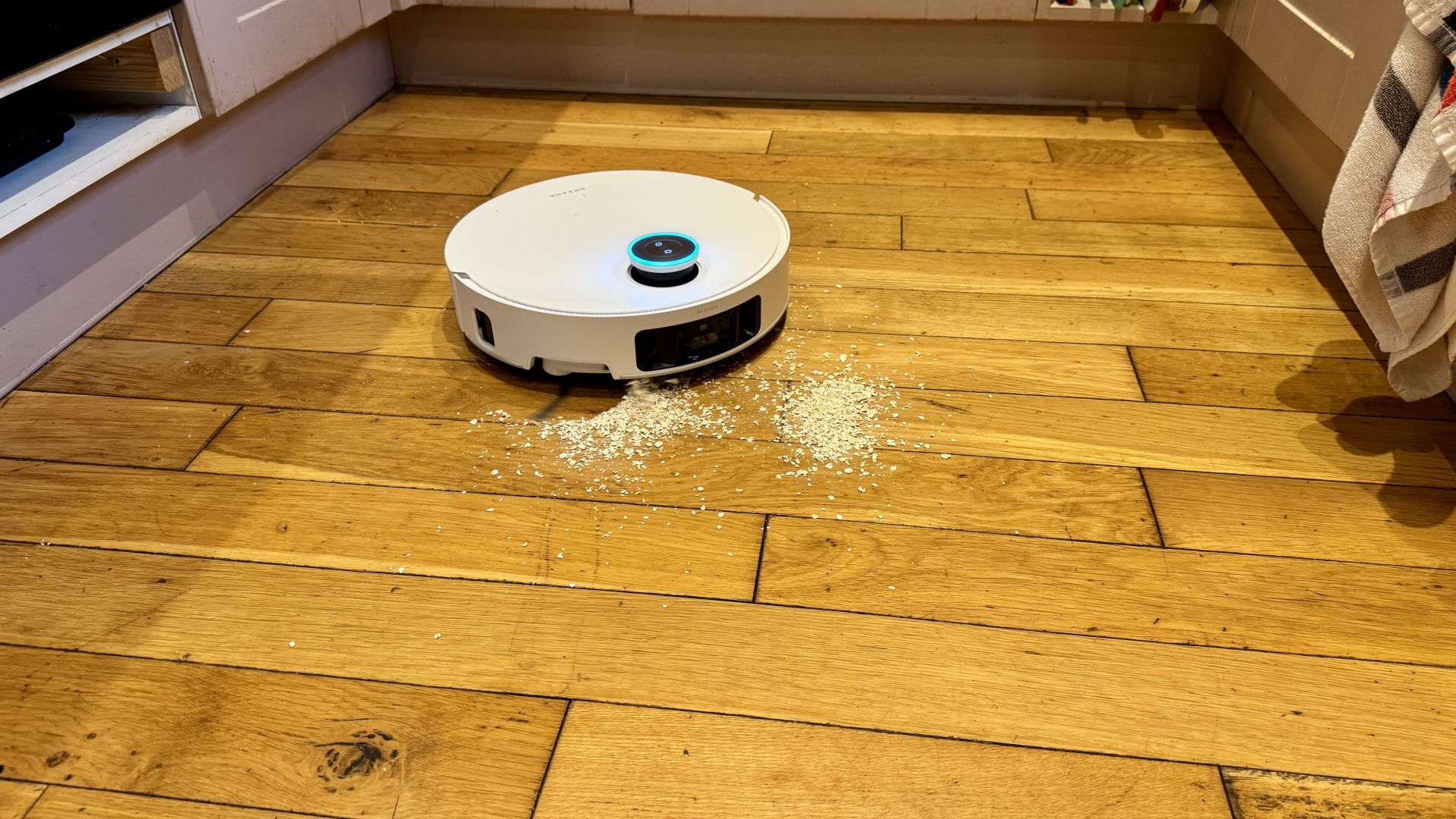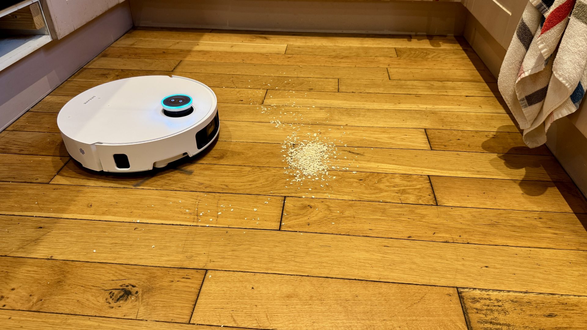 В ходе моих ежедневных тестов система влажной уборки обеспечивала плавный и равномерный результат без разводов. Она также без проблем справилась с пролитым молоком. Однако ни один гибридный робот-пылесос не идеален, когда дело доходит до удаления глубоко въевшейся грязи, толстых пятен или липких загрязнений.
