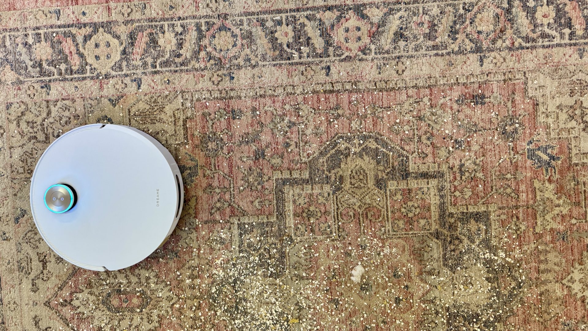 Однако я был немного разочарован его работой на ковре со средним ворсом, даже когда я установил мощность всасывания на максимум+. Для этого теста я выбрал зональную уборку в приложении и посыпал ковер щедрой порцией овсянки, риса и небольшими кусочками измельченной сухой пасты. Робот направился к ковру и начал увеличивать мощность всасывания, когда его датчик обнаружил дополнительный мусор. Затем он совершил серию узких кругов в этих местах, после чего продолжил уборку, двигаясь вверх-вниз параллельно друг другу, чтобы завершить работу.