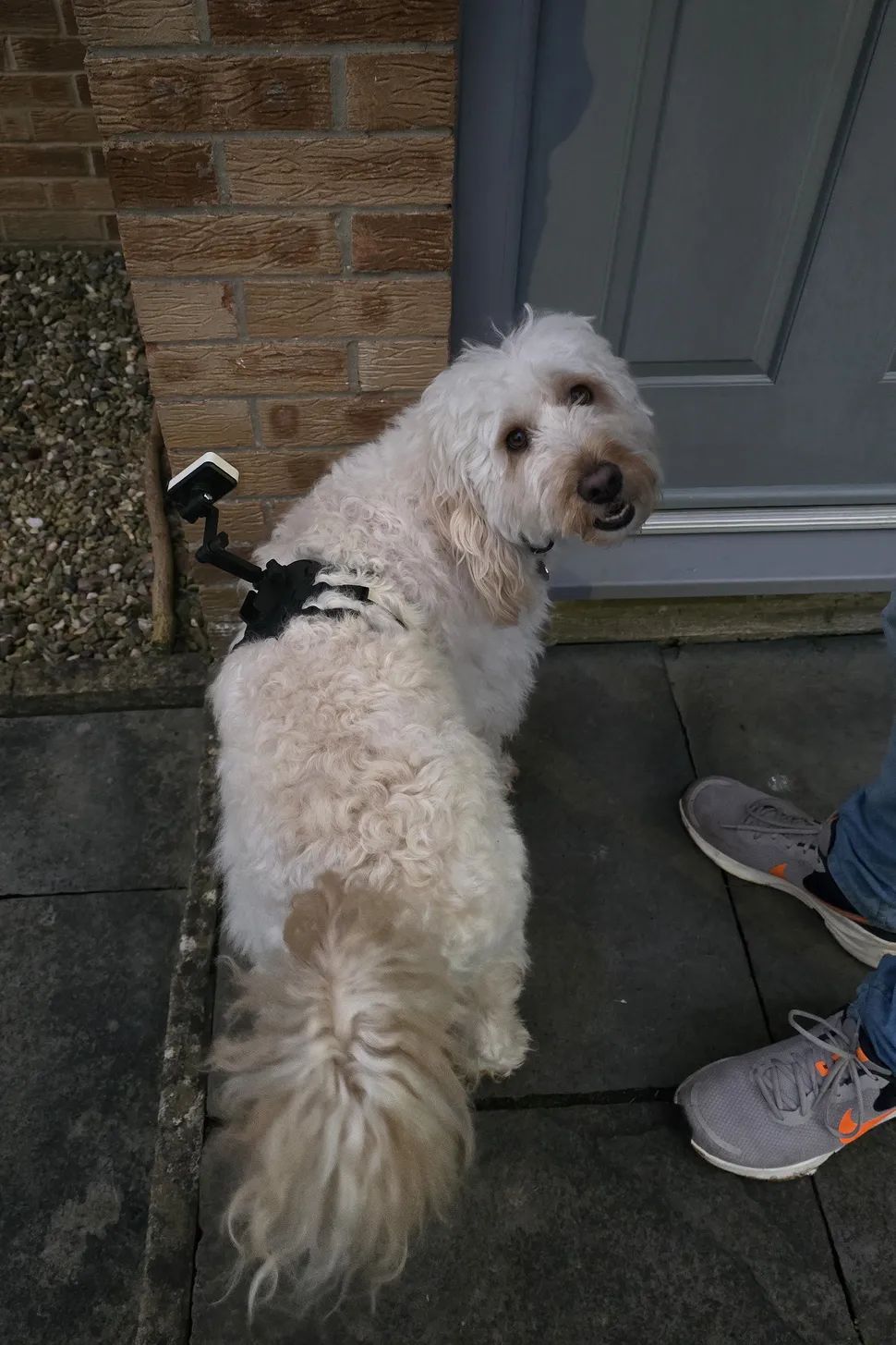 Поскольку Тилли — собака среднего размера, которая любит бегать, я экспериментировала с разными способами крепления трекера ROLA, чтобы он держался достаточно крепко и можно было сделать разборчивый снимок. Enabot предлагает несколько вариантов крепления трекера, чтобы упростить задачу, но я обнаружила, что лучше всего с Тилли работает шлейка, охватывающая всё тело, с мини-штативом, так как трекер не хотел надёжно держаться на её ошейнике.