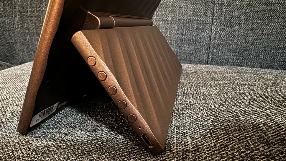 Компания Feelworld предусмотрительно разместила все элементы управления и порты на подставке, а не на самом мониторе. Благодаря такому расположению кабели, торчащие сбоку, находятся дальше от зоны вашего зрения, а не выступают из той же плоскости, что и дисплей. На правой стороне подставки расположены пять кнопок (питание и четыре кнопки для навигации по экранному меню) и порт USB-C для подключения периферийных устройств. На левой стороне подставки расположены разъём для наушников 3,5 мм, два порта USB-C (с поддержкой альтернативного режима DisplayPort) и порт mini-HDMI. Два направленных вниз динамика встроены в нижнюю часть подставки.