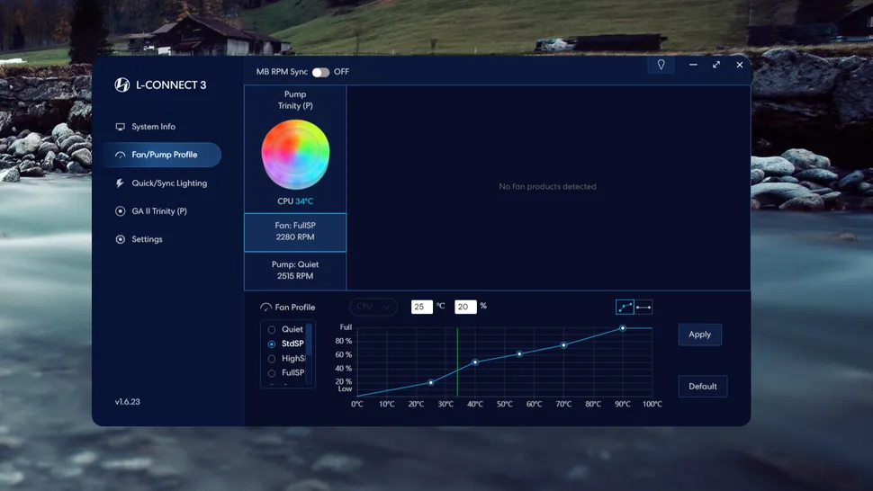 Это программное обеспечение предлагает широкие возможности настройки подсветки и скорости вращения насоса/вентилятора, а также позволяет управлять другими совместимыми устройствами ARGB. По иронии судьбы, вы также можете вернуть управление этими параметрами материнской плате с помощью опции «MB Sync» в программном обеспечении.