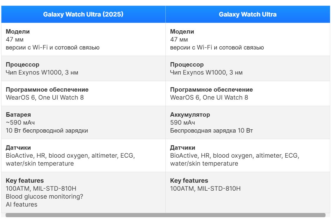 Наконец, давайте сравним характеристики Galaxy Watch Ultra (2025) и Galaxy Watch Ultra. Имейте в виду, что все характеристики Galaxy Watch Ultra (2025) могут быть изменены.