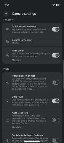 Интерфейс приложения «Камера» сильно отличается от других телефонов. Панель режимов находится под кнопкой спуска затвора, а под ней — переключатель для фото- и видеосъёмки. Из-за этого кнопка спуска затвора находится довольно высоко на экране, что сильно раздражает, если вы пользовались другим смартфоном, так как это нарушает мышечную память и заставляет нажимать на переключатель режимов вместо кнопки спуска затвора, если вы к этому не привыкли. Расположение других пунктов меню ниже также нестандартное, и это может вызывать затруднения, когда нужно быстро что-то изменить во время съёмки.